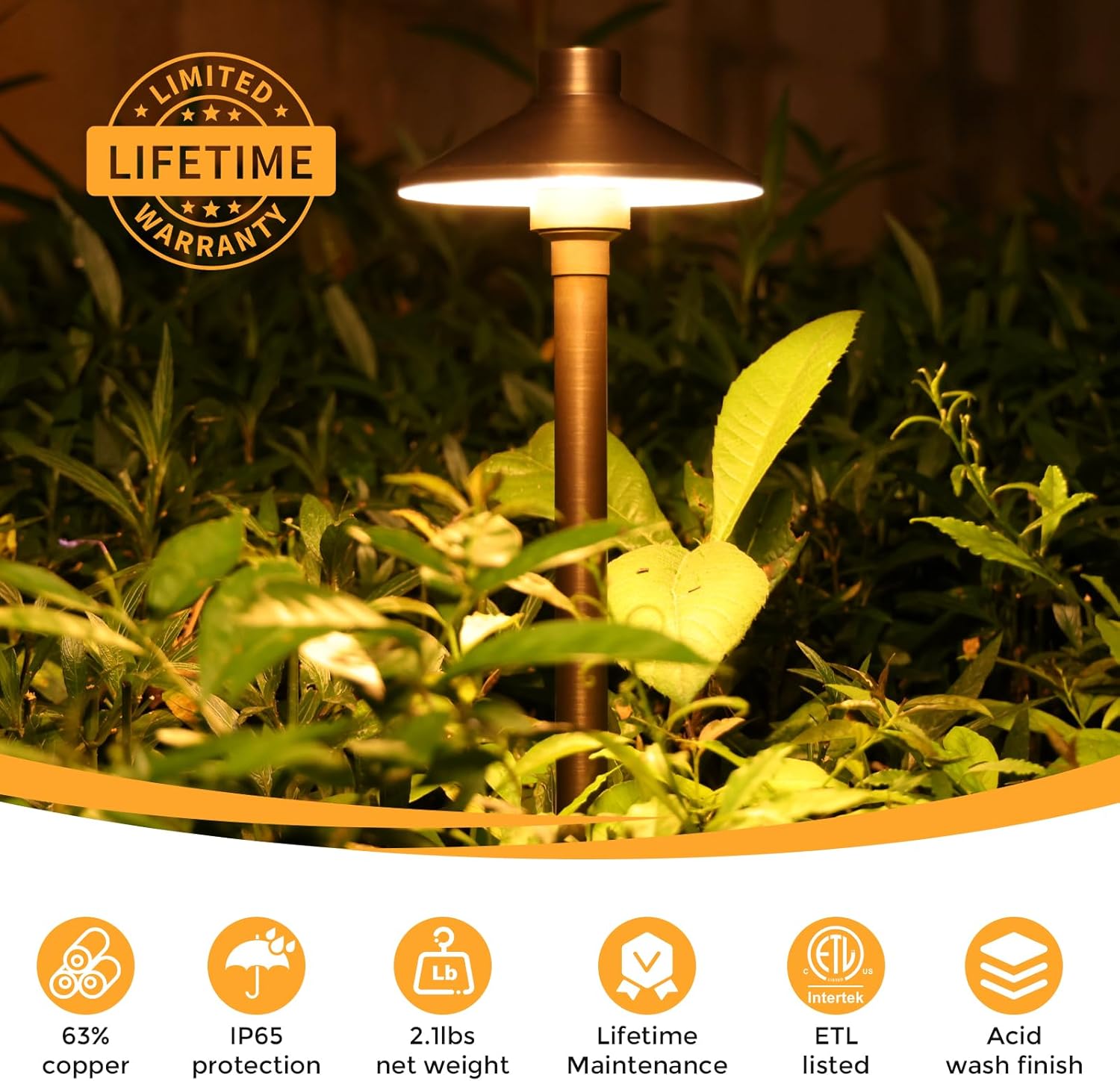- FULL BRASS HOUSING AND LARGER ABS STAKE: New and improved design from Gardencoin, 63% copper, heavy-duty construction, strong and durable landscape path light with large ground stake to keep it upright and not tilted