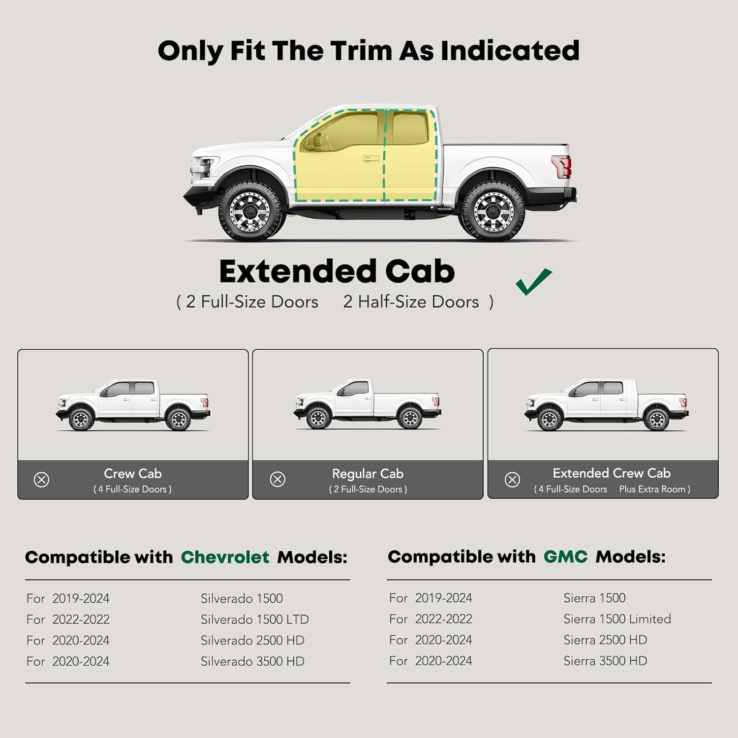 - Confident Fitment: Our side steps are compatible with Chevrolet and GMC Models: Silverado/Sierra 1500 2019-2024, Silverado 1500 LTD/Sierra 1500 Limited 2022, Silverado/Sierra 2500 HD & 3500 HD 2020-2024---Extended Cab/Double Cab Pickup (2 Full Size & 2 Narrow Doors); Exclude 2019 1500 LD. Our excellent sidebars are long-lasting and will enhance the appearance of your vehicle.