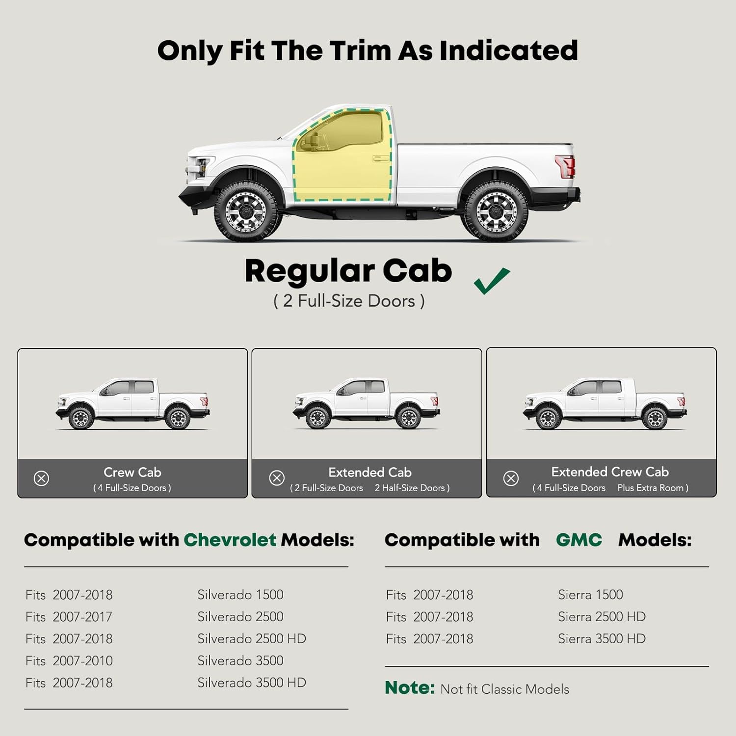 - Perfect Fit Side Bar: Our cab length running boards are fit for Chevrolet and GMC Models: Silverado/Sierra 1500 2007-2018, Silverado 2500 2007-2018, Silverado/Sierra 2500 HD 2007-2019, Silverado 3500 2007-2010, Silverado/Sierra 3500 HD 2007-2018---Standard Cab/Regular Cab (2 Front Doors); Excluding C/K Classic. YHTAUTO are committed to creating an all-around quality side bars that do more than just make it easy for you to get in and out of your car