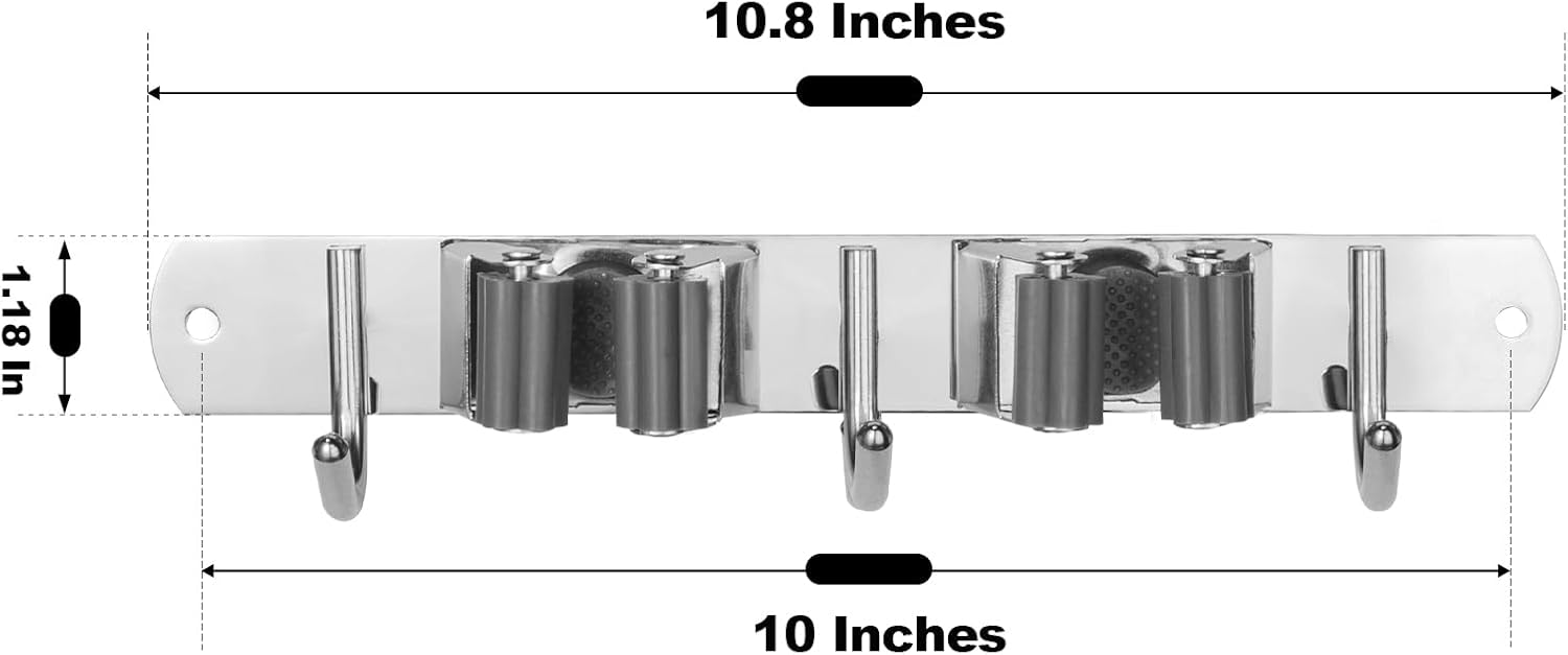 - [Sturdy & Non-slip] The broom and mop holder wall mount with 2 slots and 3 hooks is made of rustproof 304 stainless steel, which is beautiful and much more durable than plastic materials, It's non-slip high elasticity clips can holds your broom, mop, umbrella or other garage tools firmly. You can install the tool storage rack with self-adhesive or screws to mount on the wall.