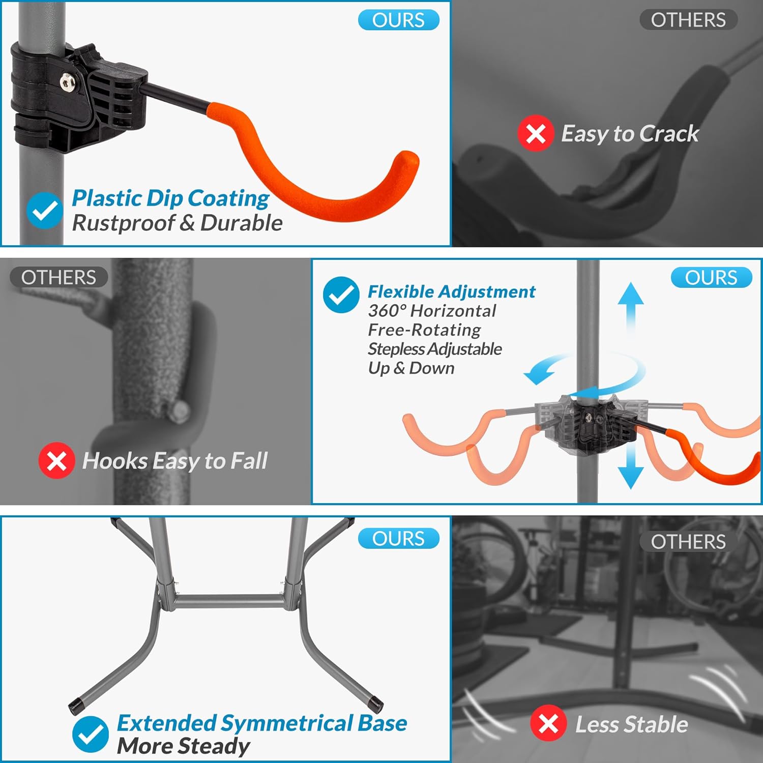 - Adjustable Support Arms: The rack features a unique hook design with flexible adjustments, allowing for 360°horizontal rotation and stepless vertical adjustments. This versatility makes it compatible with any type and size of bicycles, including road, mountain, hybrid, E-bike and children's bikes. The arms are equipped with anti-slip pad to ensure they remain securely in place once adjusted. The hooks are plastic dip coated to prevent scratching the bike's paint and are more durable than rubber.