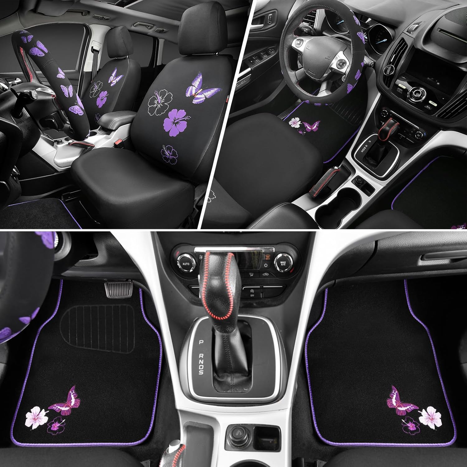 - 【Complete Car Interior Accessories】Includes 2 front set of butterfly seat covers, 4 butterfly floor mats and a butterfly steering wheel cover to give your car a new look.