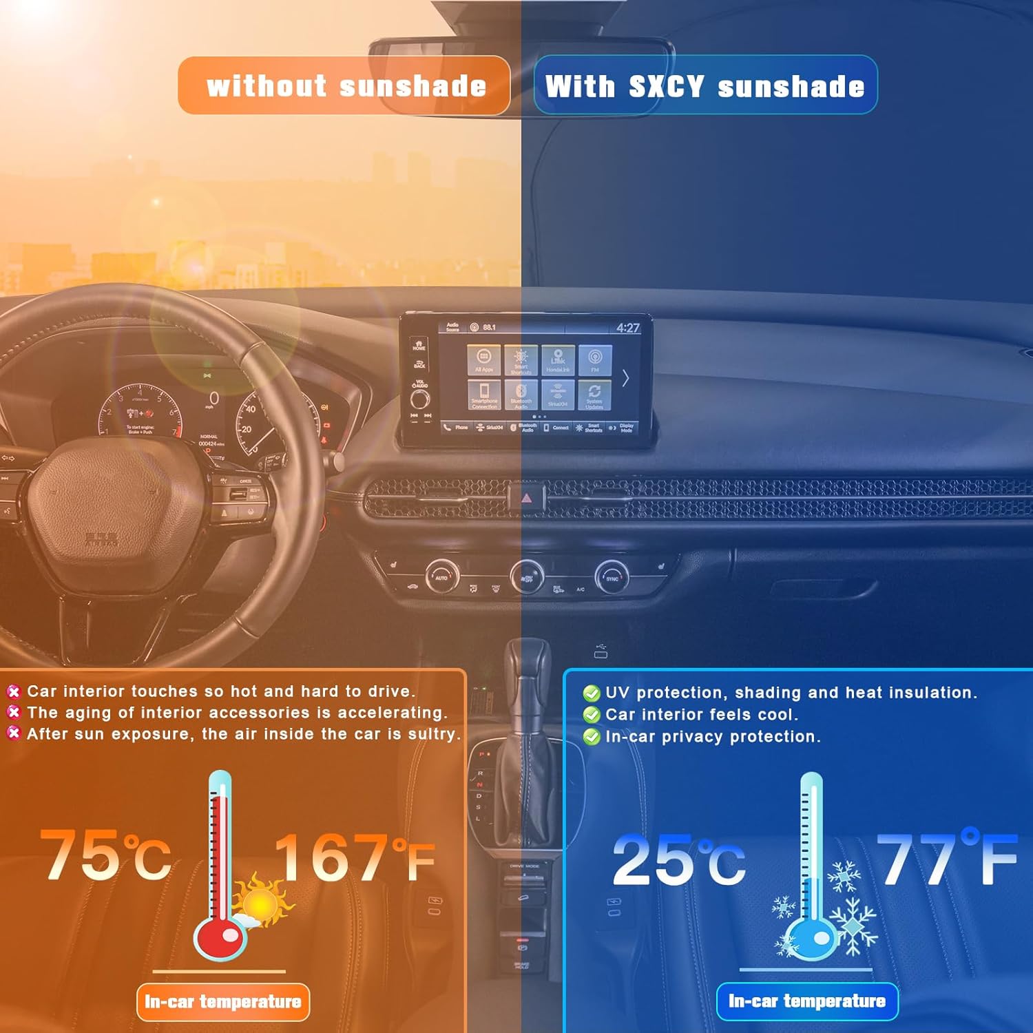 - 2.Sun Protection: Solve your concerns about parking for a long time under the scorching sun,prevent the car's interior from getting sunburned and extend your car interior accessories’life.