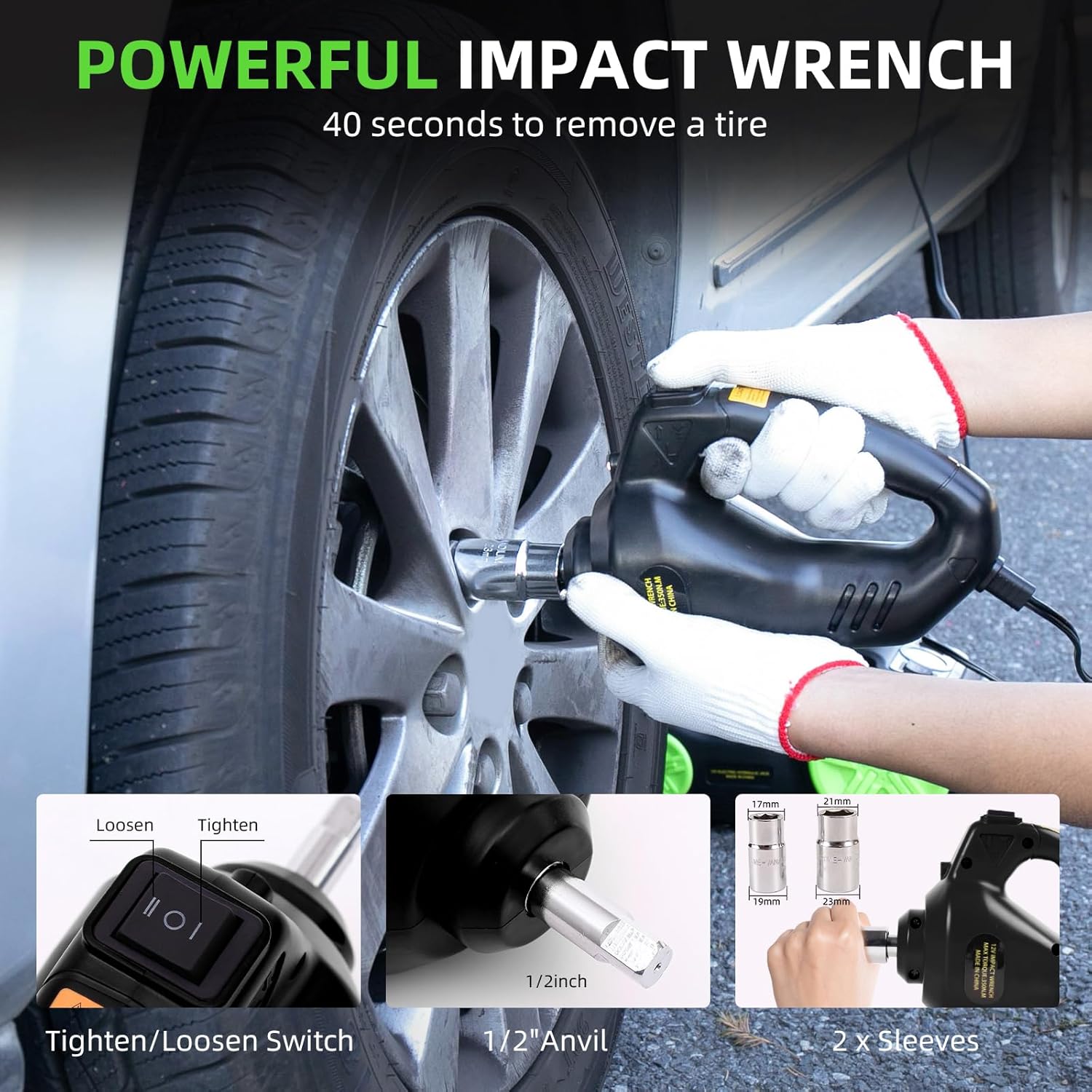 - Powerful Impact Wrench: This car jack kit includes an electric impact wrench with ABS shell, rust-proof steel body, and high-performance copper motor. Delivers low noise, high power, and strong torque for fast bolt removal and 360Β° rotation
