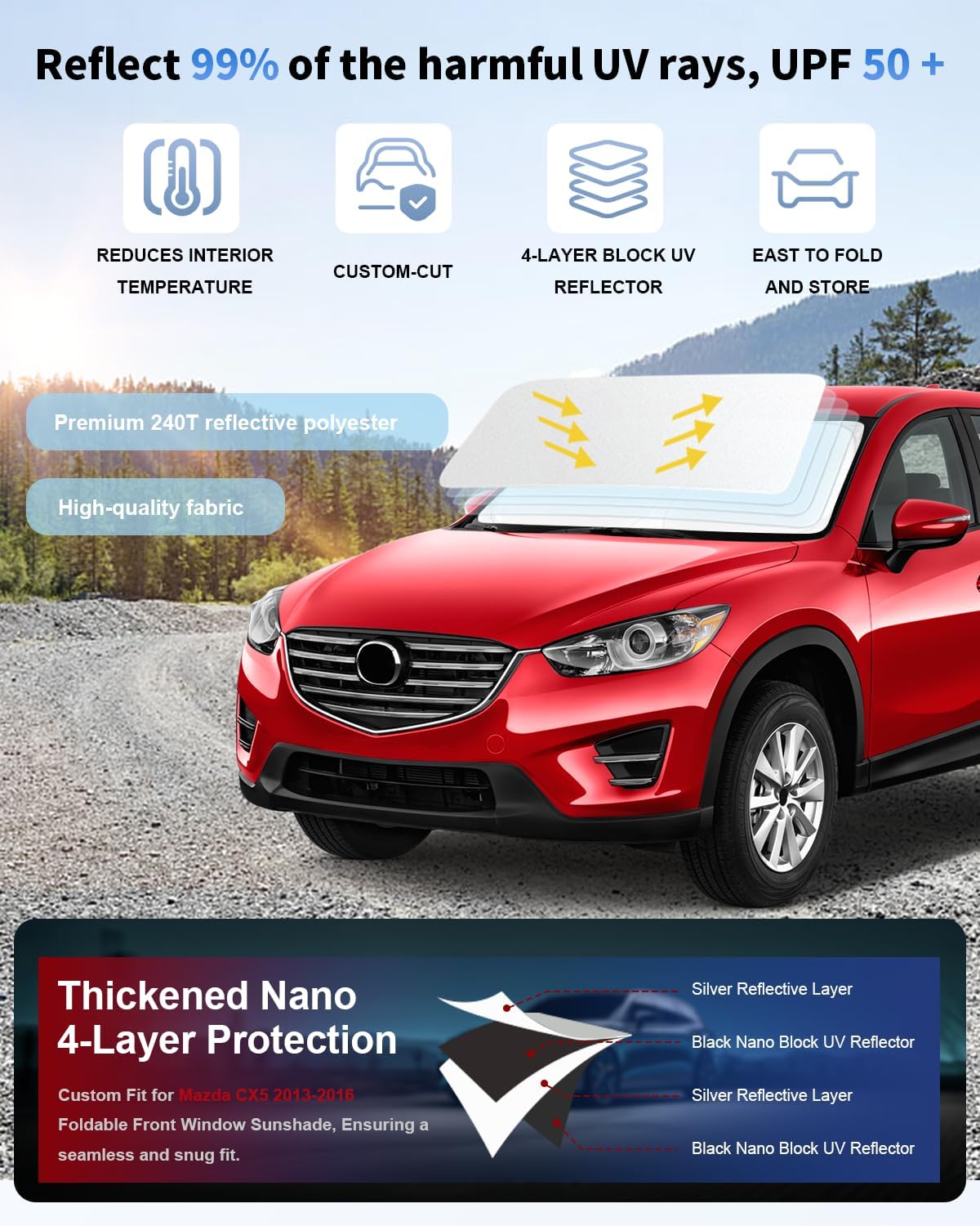 - ăCustom fitment DesignăEnhance your driving experience with the SLOGENTO Windshield Sunshades, specially designed for Mazda CX5 owners.Its custom cut design and reinforced steel rings ensure a secure fit, Perfectly fit for 2016 2015 2014 2013 Mazda CX-5 CX5 Crossover.
