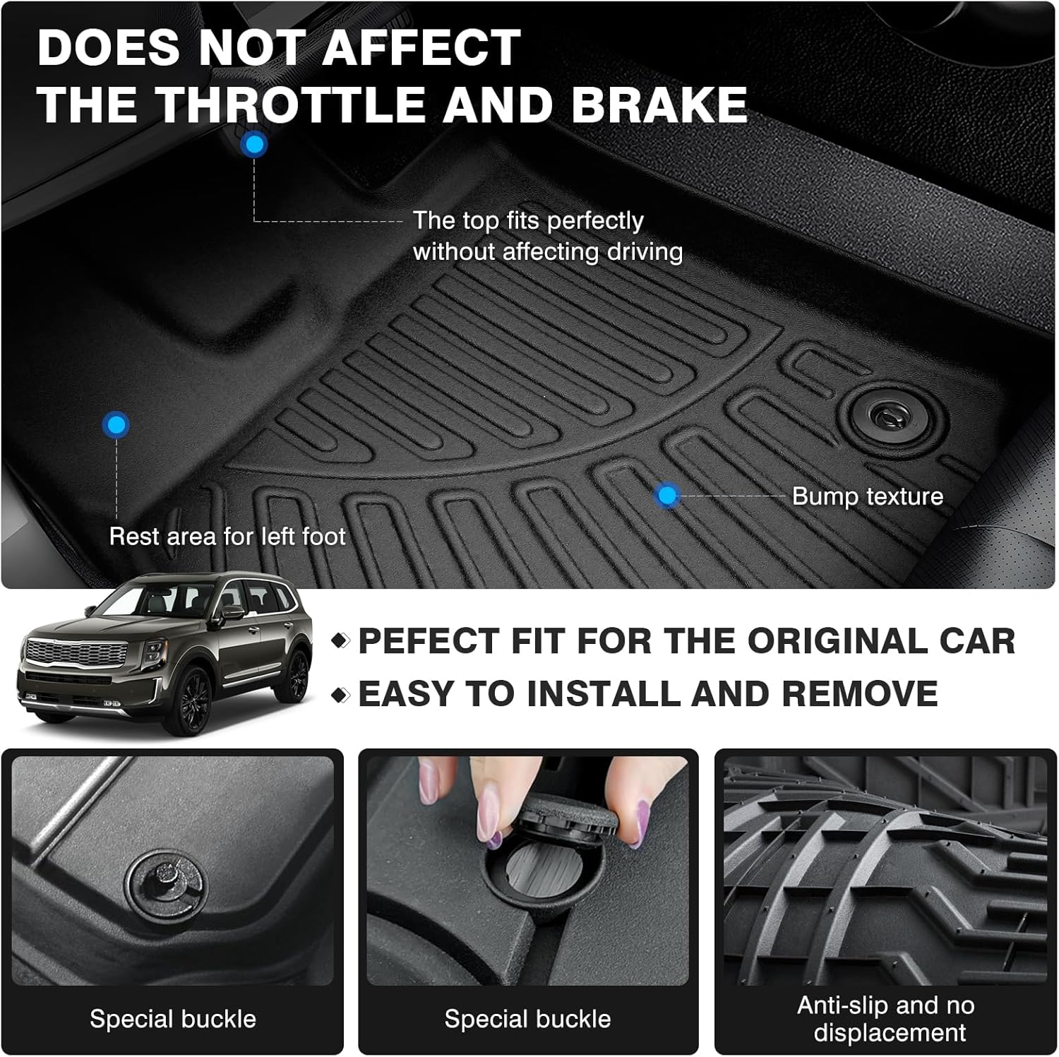 Powerty Floor Mats for 2020-2025 2026 Kia Telluride 7 Seats Accessories All Weather Floor Liner 3D TPE Floor Mat Heavy-Duty Floor Liners