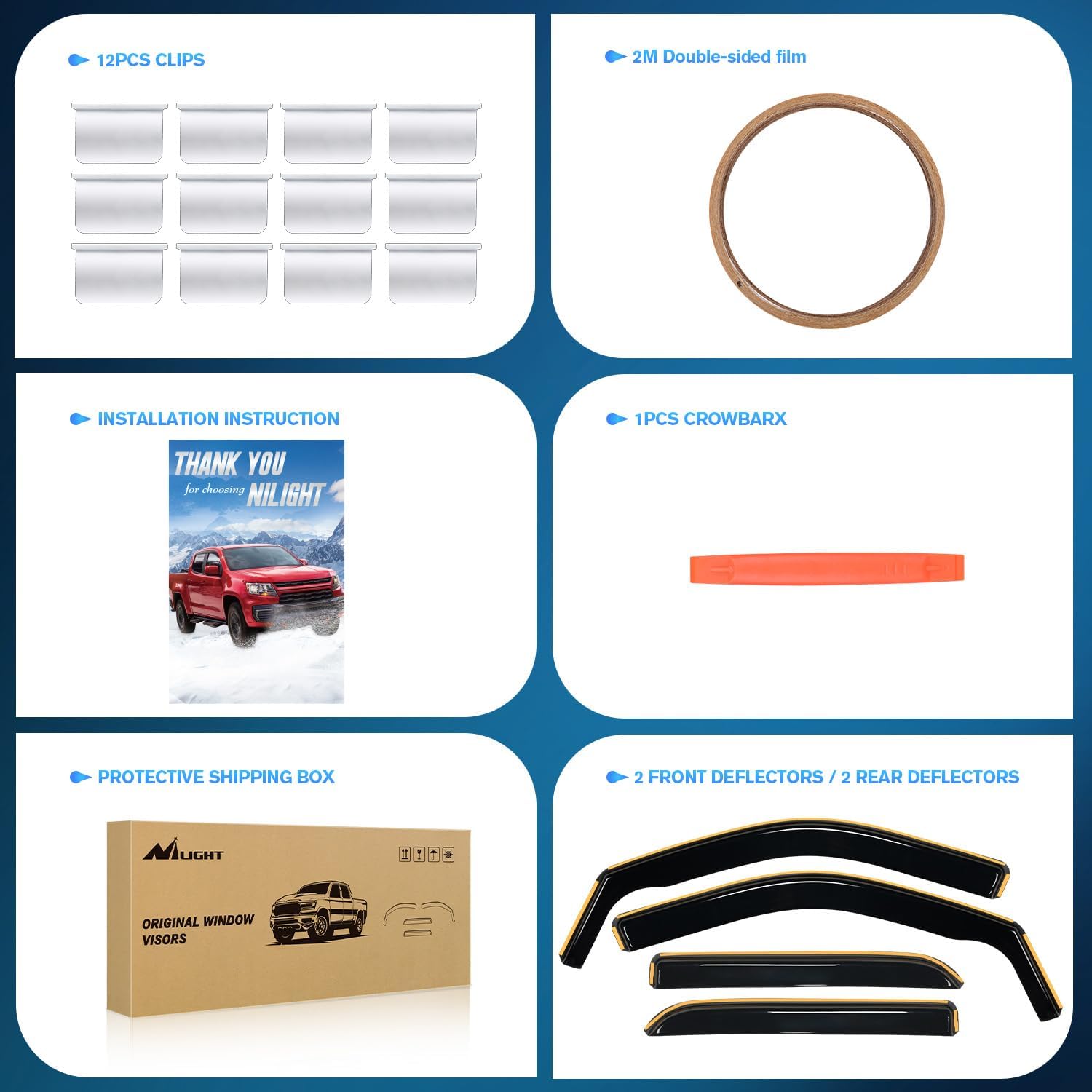 - QUICK AND EASY INSTALL: Nilight Wind Deflectors provides perfect fit for your Car. Just slip it onto your carโs window and your job is done within minutes. There is no drilling or no tools required. Be sure that window deflectors are water resistant, sun protective and will not bend, break or crack regardless of the weather conditions