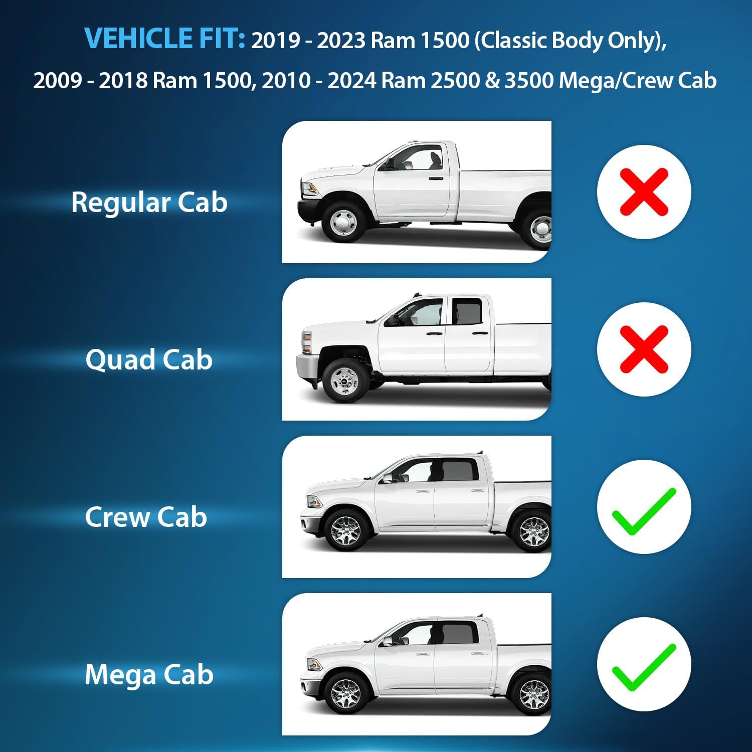 - FITMENT:2009 - 2018 Ram 1500, 2010 - 2024 Ram 2500 & 3500 Mega/Crew Cab, 2019 - 2023 Ram 1500 (Classic Body Only)