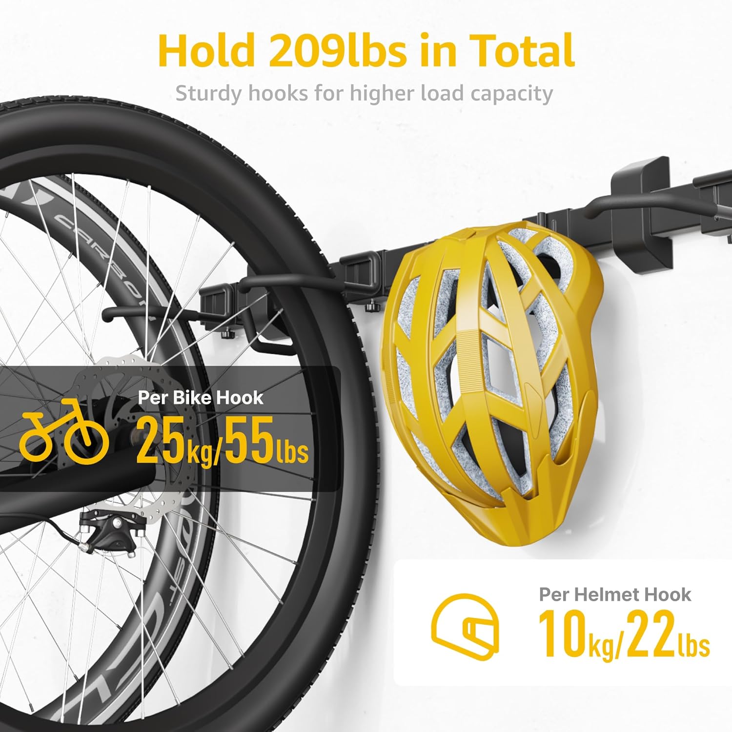 - 【STURDY & DURABLE STRUCTION】 Discover the unbeatable strength and longevity of monTEK's Bike Wall Mount. Engineered from premium steel, its unique and robust structure guarantees exceptional durability. Unlike other market bike mount prone to bending, our garage bike rack promises peace of mind by preventing bent rails, bike drops, or wall damage. With each bike rack able to support up to 55 lbs and each helmet hook bearing 22 lbs, our rack supports a total of 209 lbs, providing a secure and reliable storage solution you can trust.