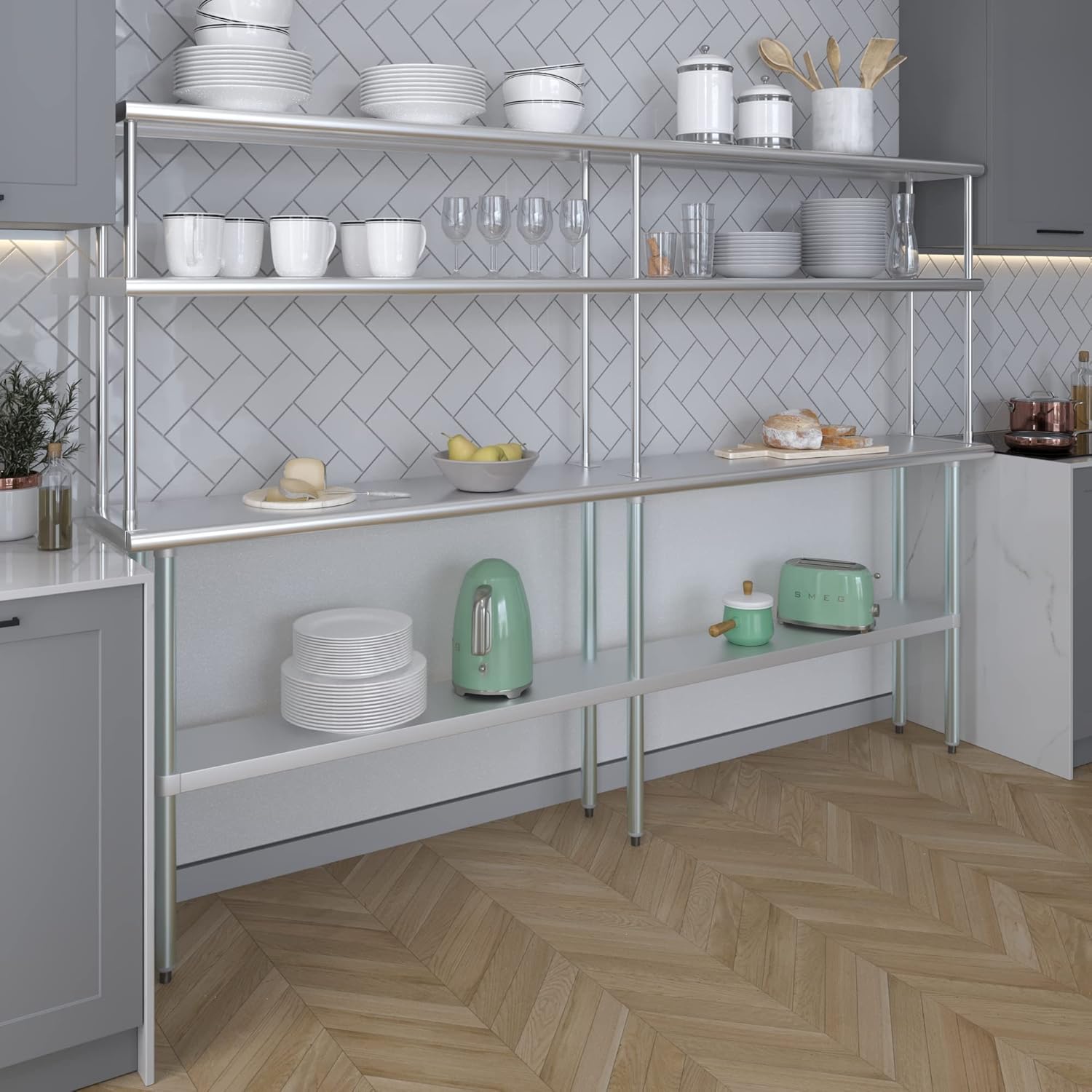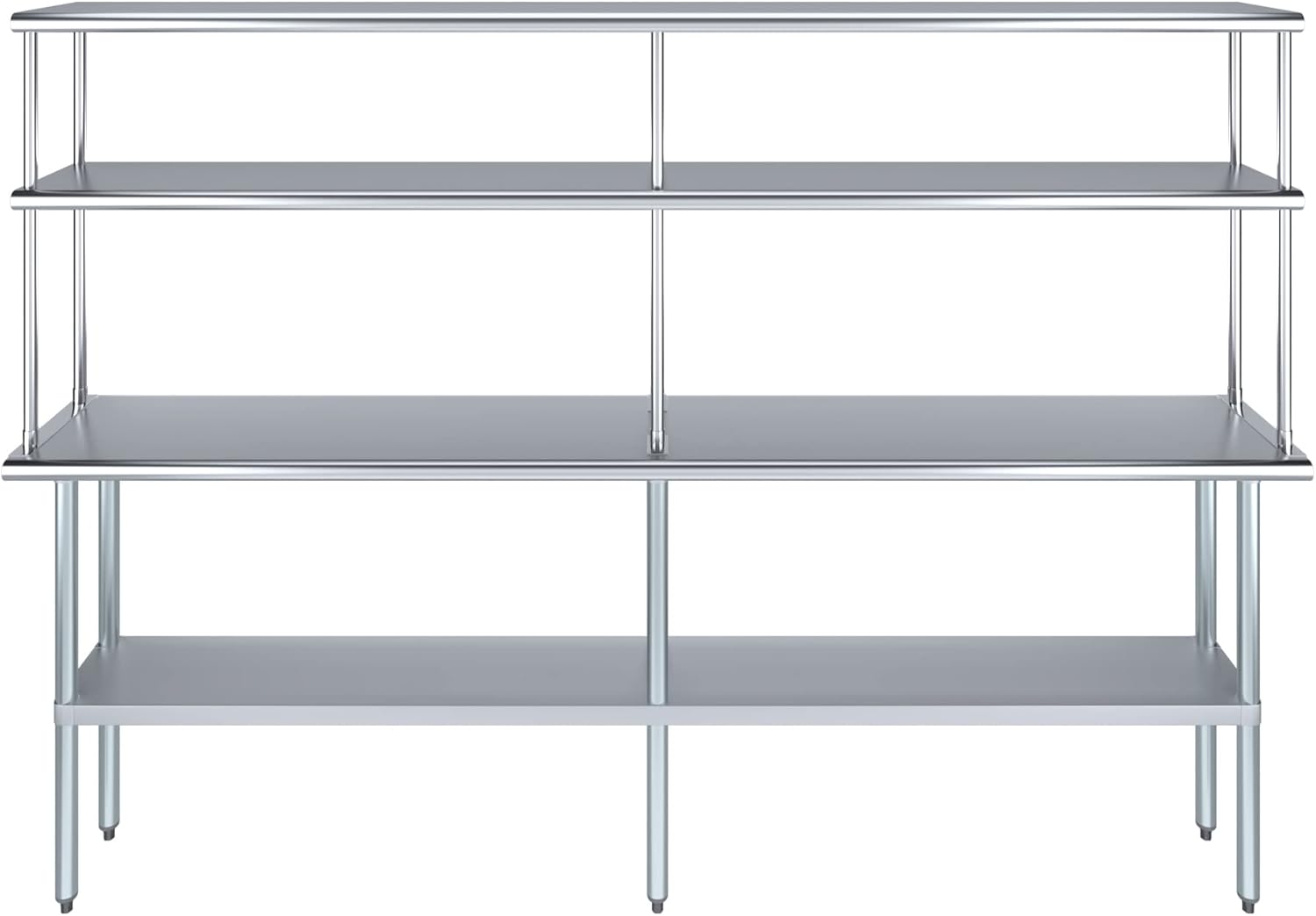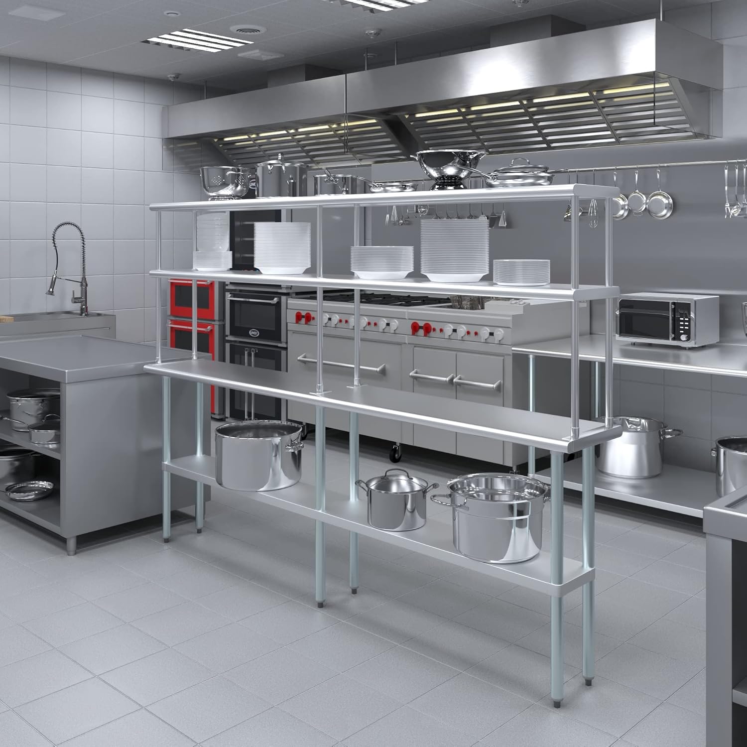 - WORK SAFETY: Work table top and double tier adjustable shelves are constructed from 18-gauge stainless steel, making this restaurant prep and serve table and double tier shelf combo set is durable and long lasting. The table top comes with a galvanized under-shelf for additional storage and adjustable legs for convenience. This table and shelf set is specifically designed and finished for use in a commercial or industrial setting, but is just as reliable in the home.