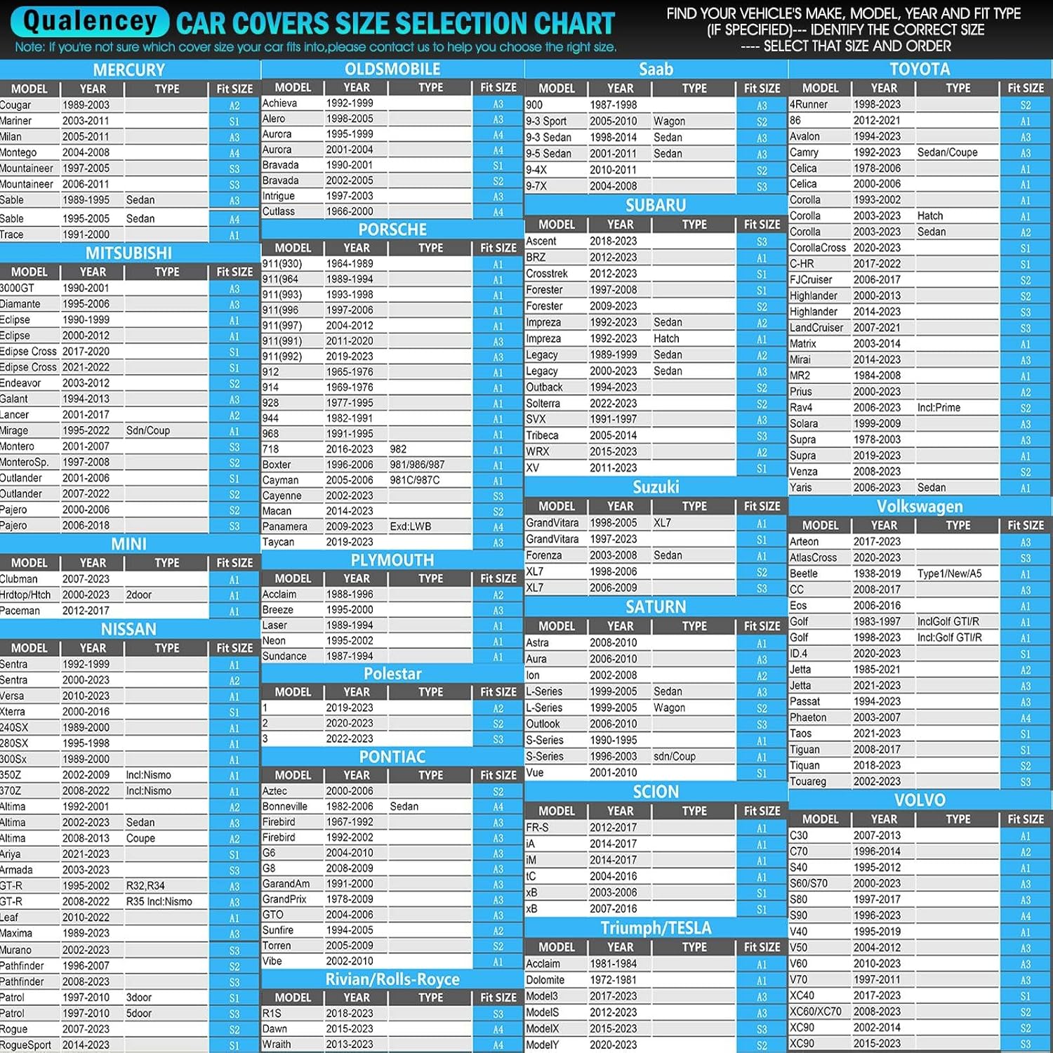 - 【Complete Protection】: The Qualencey car cover is perfect for indoor and outdoor use, protecting your car from UV rays, snow, rain, frost, sand, dust, leaves, branches, and birds, whether in sunlight or cold weather.