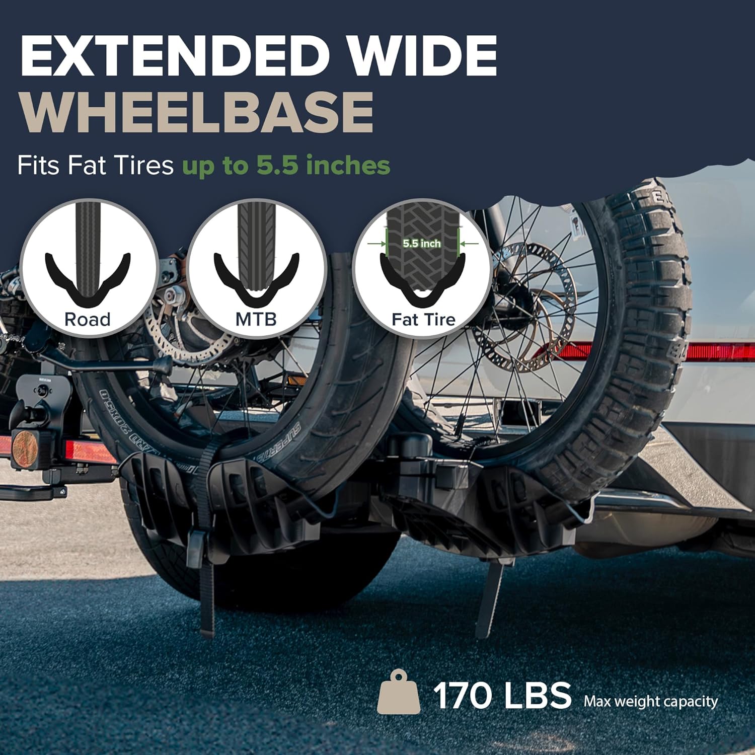 - [Upgraded Material & Design] - Crafted from heavy duty powder-coated alloy steel, this 2-bike electric hitch rack supports up to 85 lbs per bike and a total maximum load of 170 lbs. Its flexible wheel cradles securely accommodate road bikes, mountain bikes, and fat tire bikes with ease. The design snugly fits both narrow and wide bike tires, up to 5.5" in width. They all align neatly and evenly for a safe and efficient transport solution