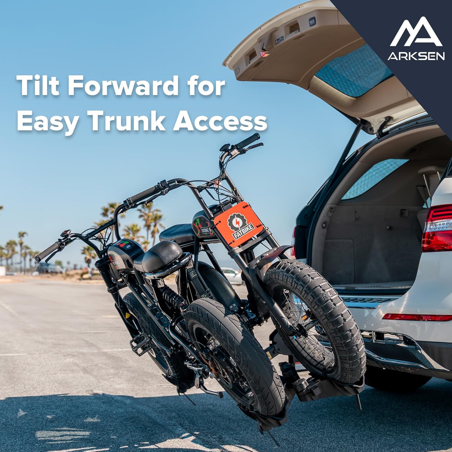 Arksen Electric Bike Rack Hitch, Foldable Quick Release Smart Tilting 2 Ebike Rack Platform Style Carrier w/Car Lock for Up to 5.5" Fat Tires for Car, SUV, Trucks - 170 lbs Heavy Weight Capacity