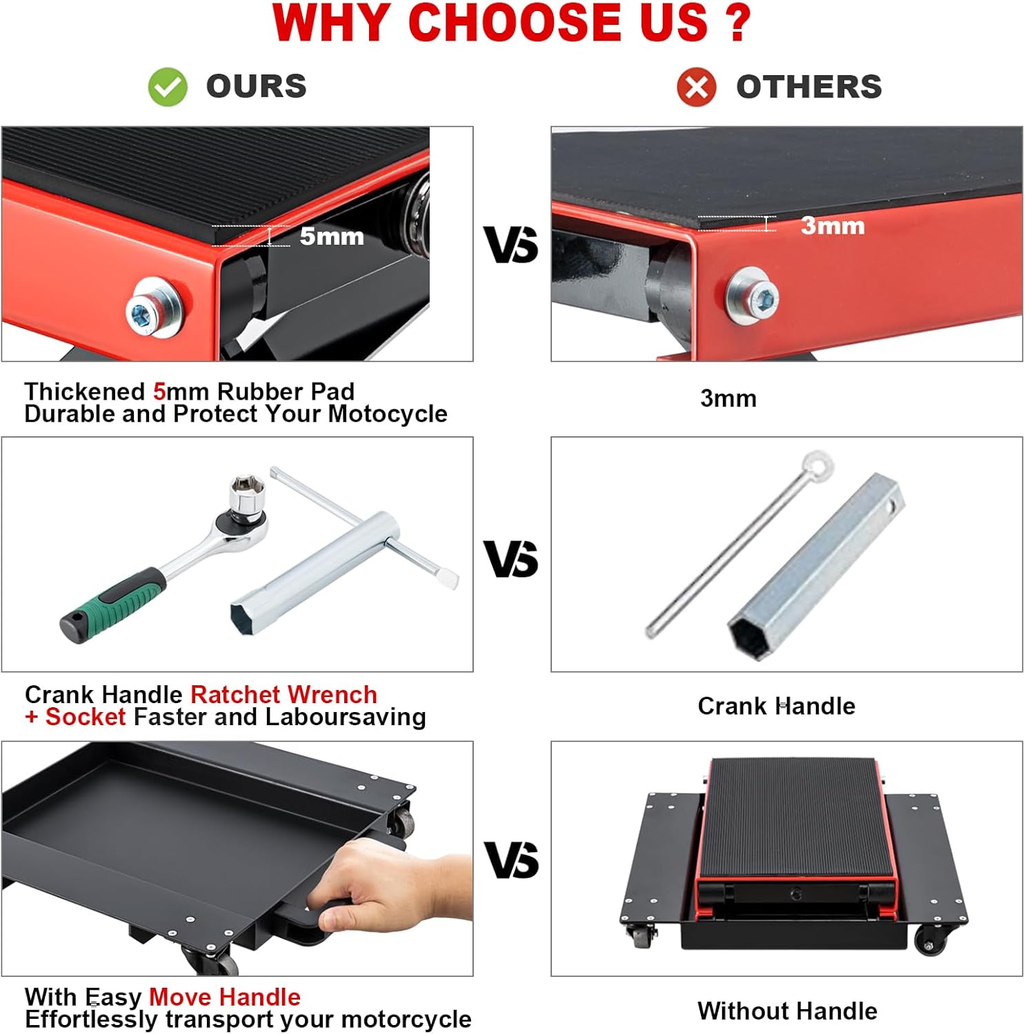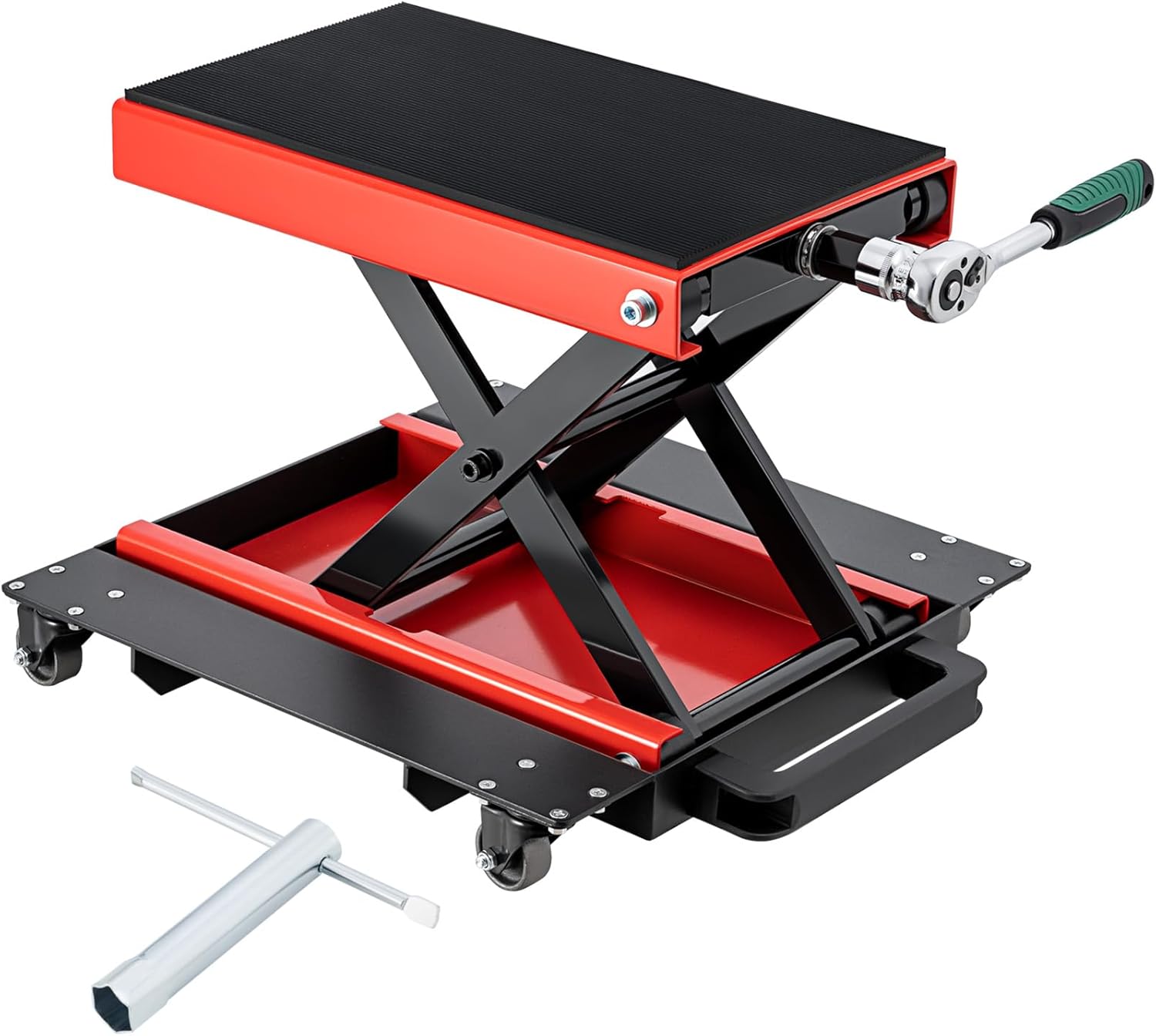 - Laboursaving ๏ผ In addition to the crank handle,we also have an extra ratchet wrench,which is easier to use than crank handle,you will spend less effort to lift the motorcycle up quickly