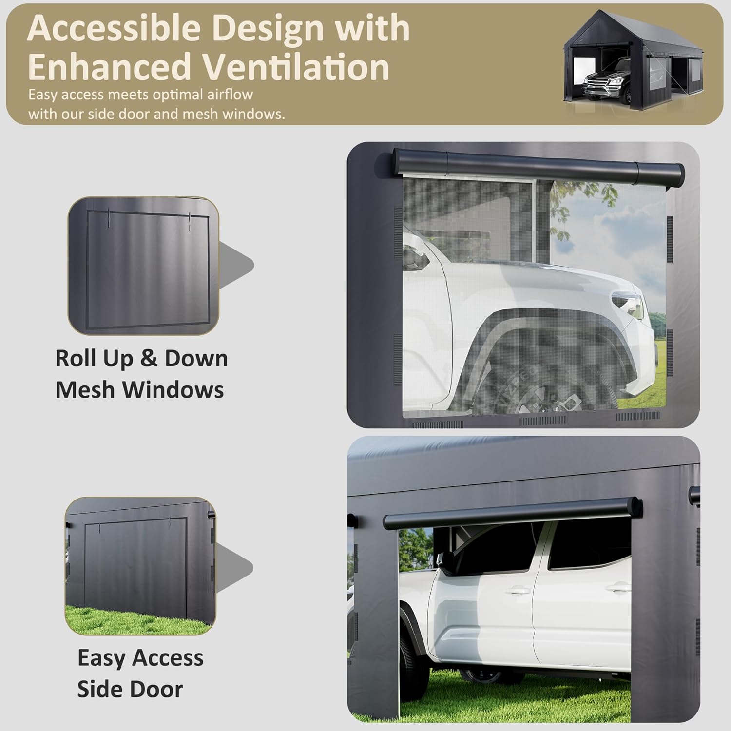 - 【Roll-Up Windows & Side-Opening Door】Compared to other carports, there are a total of four windows on both sides to maintain excellent ventilation. Unique side-opening door not only facilitates ventilation but also easy access.