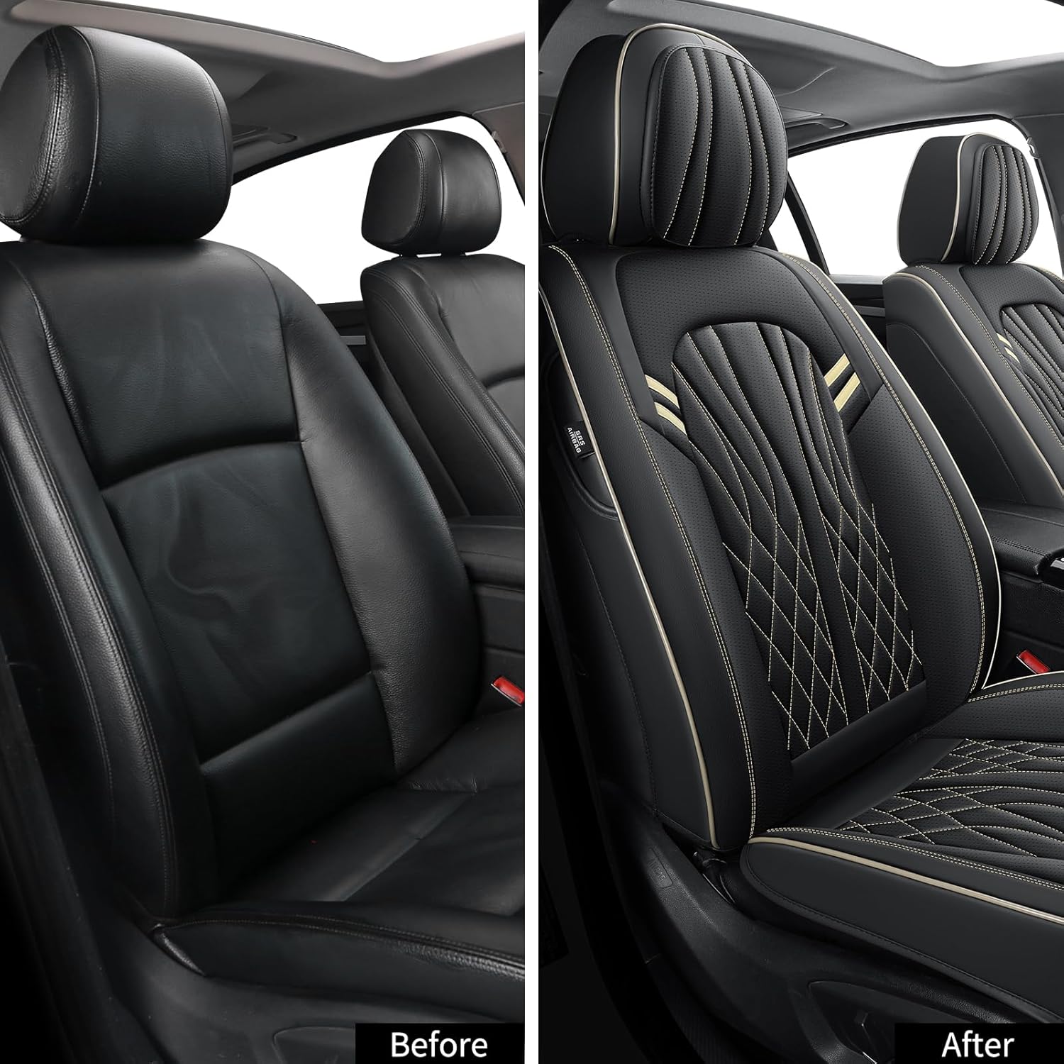 Seat Covers for Cars, Waterproof Seat Covers, Leather Car Seat Covers 2 Pack, Universal Seat Cushion Protector for Most Cars Black&Beige Line