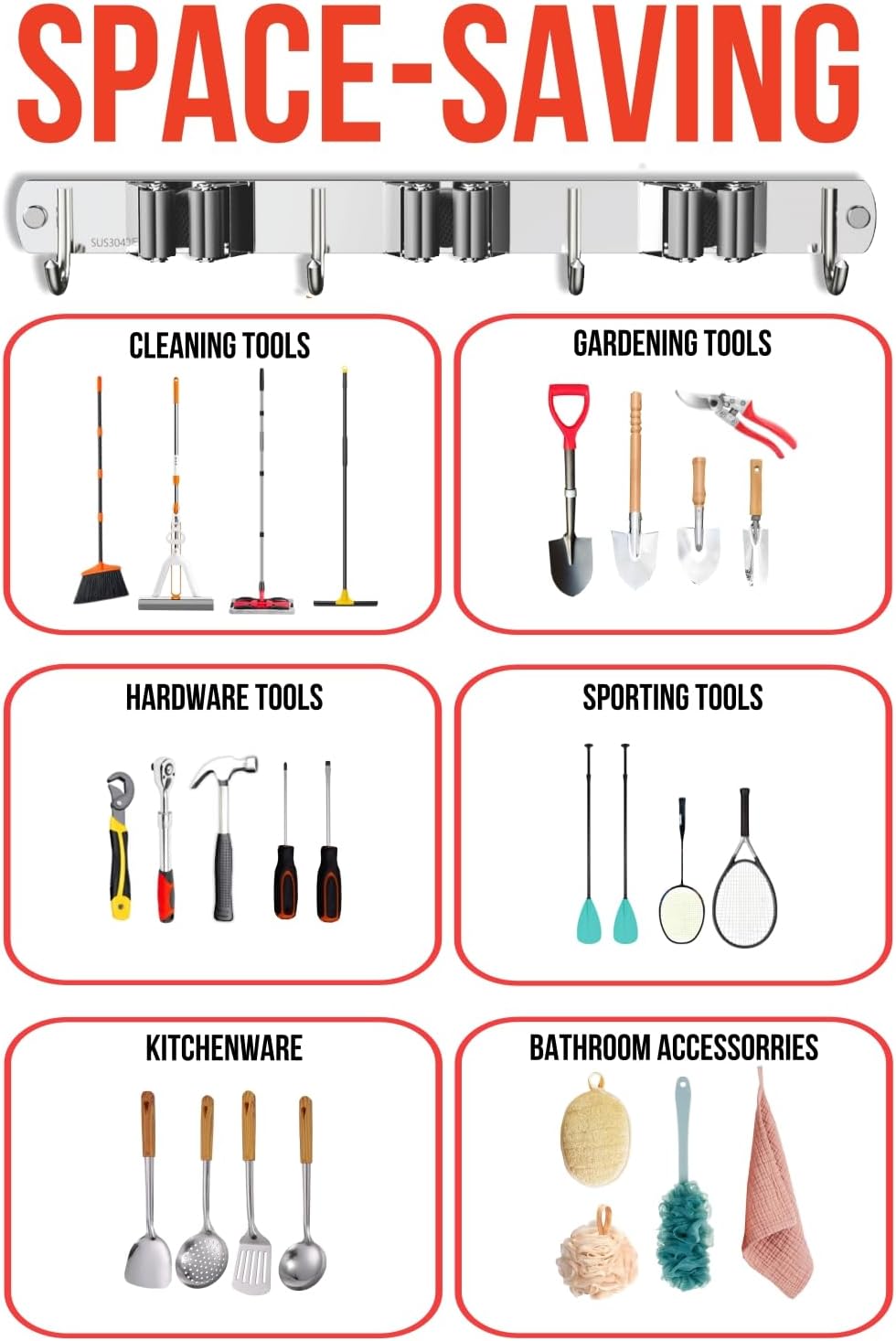 - SAVE SPACE: The wall hangers for brooms and mops provides you easy access to store and grab brooms, dustpans, mops. This tool organizer with 5 gripers and 4 utility hooks allows you to hold brooms, mops, brushes, rakes, garden tools, etc