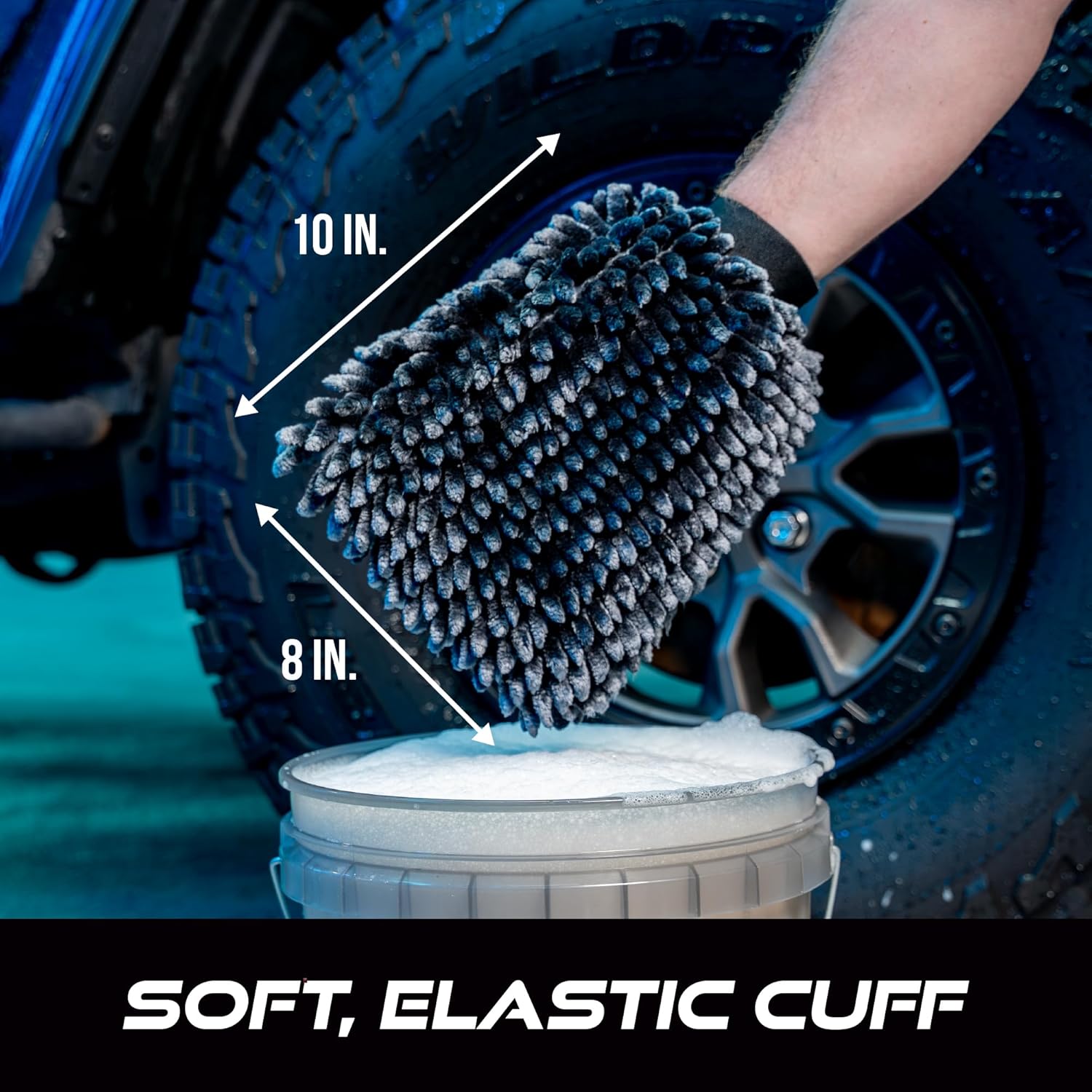 - Pack of 2 scratch free microfiber wash mitt measuring 10 inches long and 8 inches wide