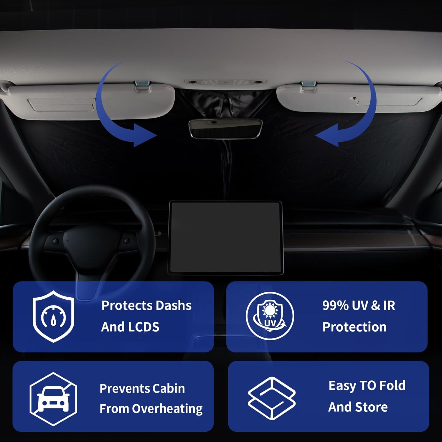 - ăBetter Heat Reduction & Sun Blocking ăMore full sun protection: The new double D-shaped steel ring design makes the sunshade fit more closely to the front window, reducing light leakage and enhancing the blocking effect.