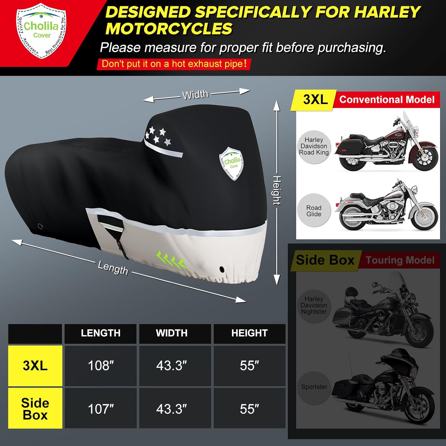 - Fit For: 108 "L x 43" W x 55 "H. The cover is designed for motorcycle conventional models, which is suitable for Harley Davidson, HONDA, INDIAN, DUCATI, BMW, SUZUKI, Triumph Tiger, KTM, YAMAHA, KAWASAKI