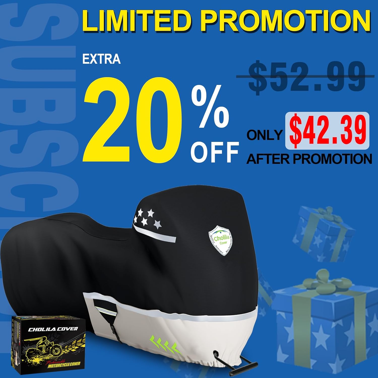 - Coverage : Motorcycle (Full Exterior Coverage, Size: 108" L x 43" W x 55" H)