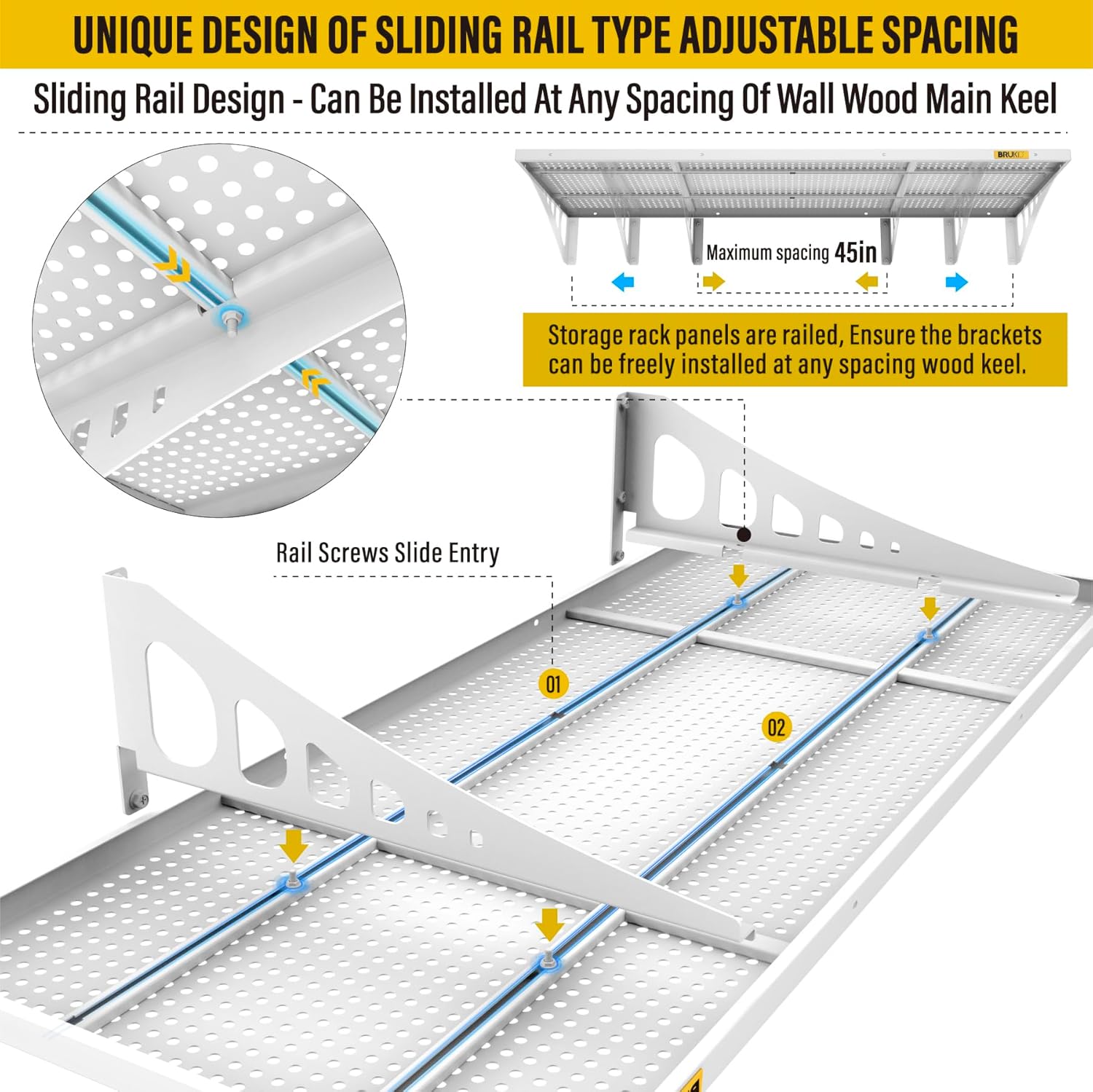 - SUPERIOR DESIGN: Wall shelf garage storage rack panel is made of whole piece of perforated steel plate bending and welding, the surface of matte high temperature powder baking paint, flat and smooth; the panel adopts slide rail design, can be adjusted by parallel left and right sliding at will; bracket can be freely installed in 45β range of the spacing of the wood wall keel, without affecting the precision connection with the panel, eliminating the worry of being unable to docking due to the mismatch of spacing points of load-bearing wood wall keel or inaccuracy of the installation of the bracket. It saves time and labor