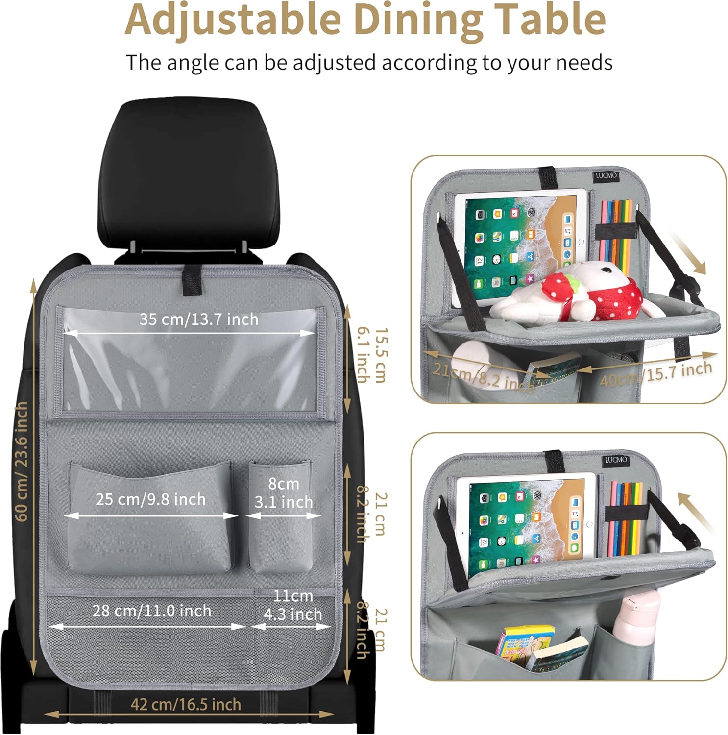 LUCMO Car Backseat Organizer with Tablet Holder-2 Pcs,6 Storage Pockets Car Storage Organizer with Foldable Food Tray Protectors Kick Mats Travel Accessories-Grey