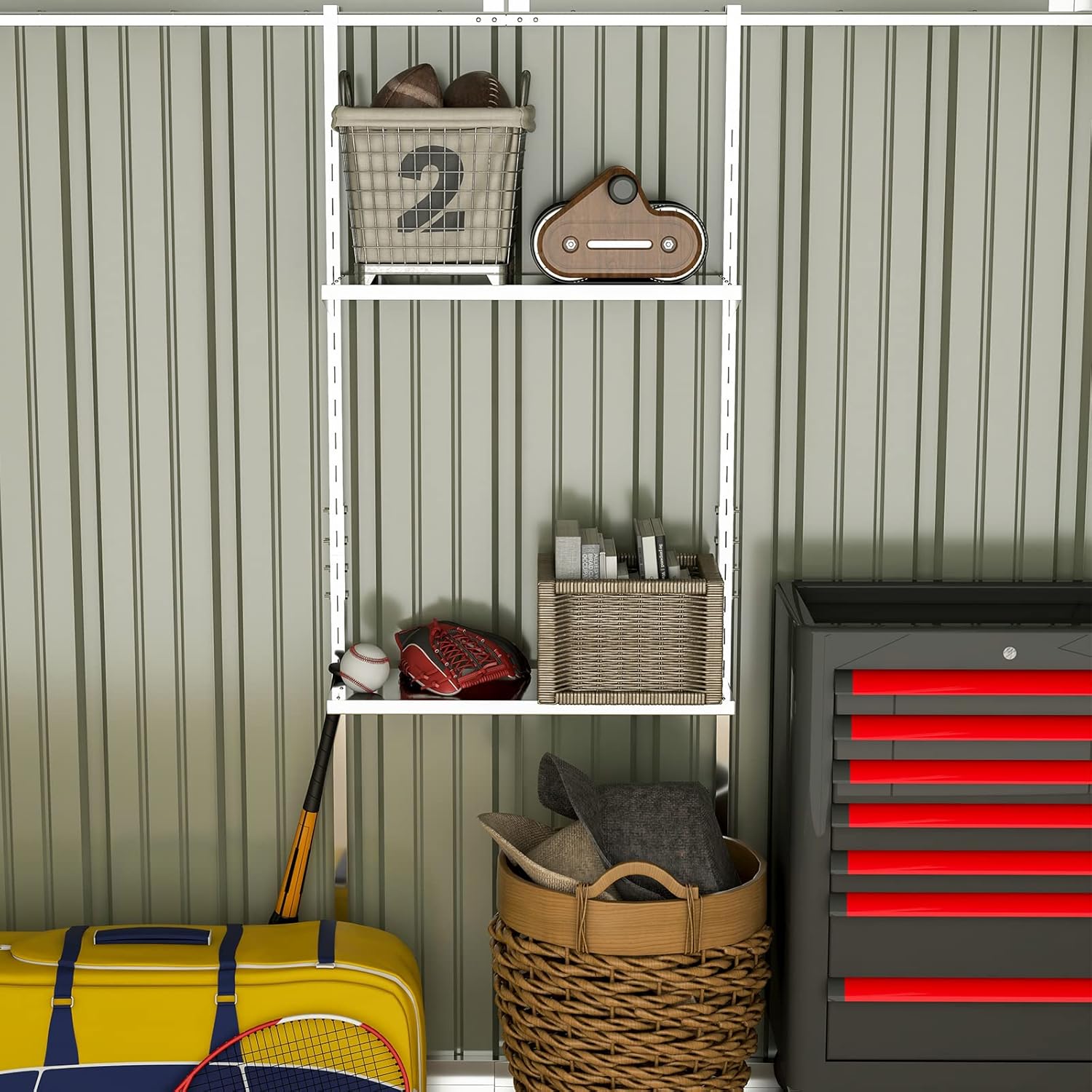 - 【Modern Design】The sleek metal exterior not only adds a contemporary touch to your outdoor space but also complements your surroundings, enhancing the aesthetic appeal of your property. Storage racks also enhance the overall aesthetics of your tool shed by creating a clean look.