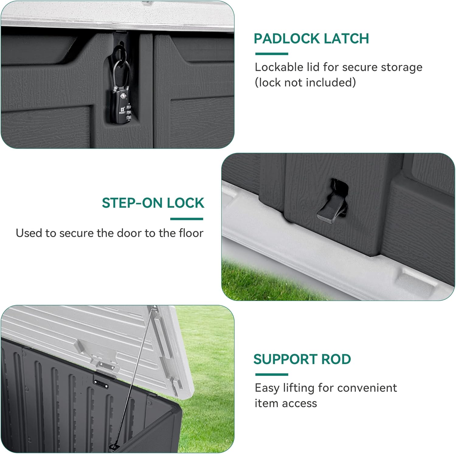 - Versatile Functionality: With multiple opening directions and flip cover support rod, this great shed allows for quick and easy storage; Padlock latch (lock not included) ensures safer storage and step-on lock secures the door to floor for convenience