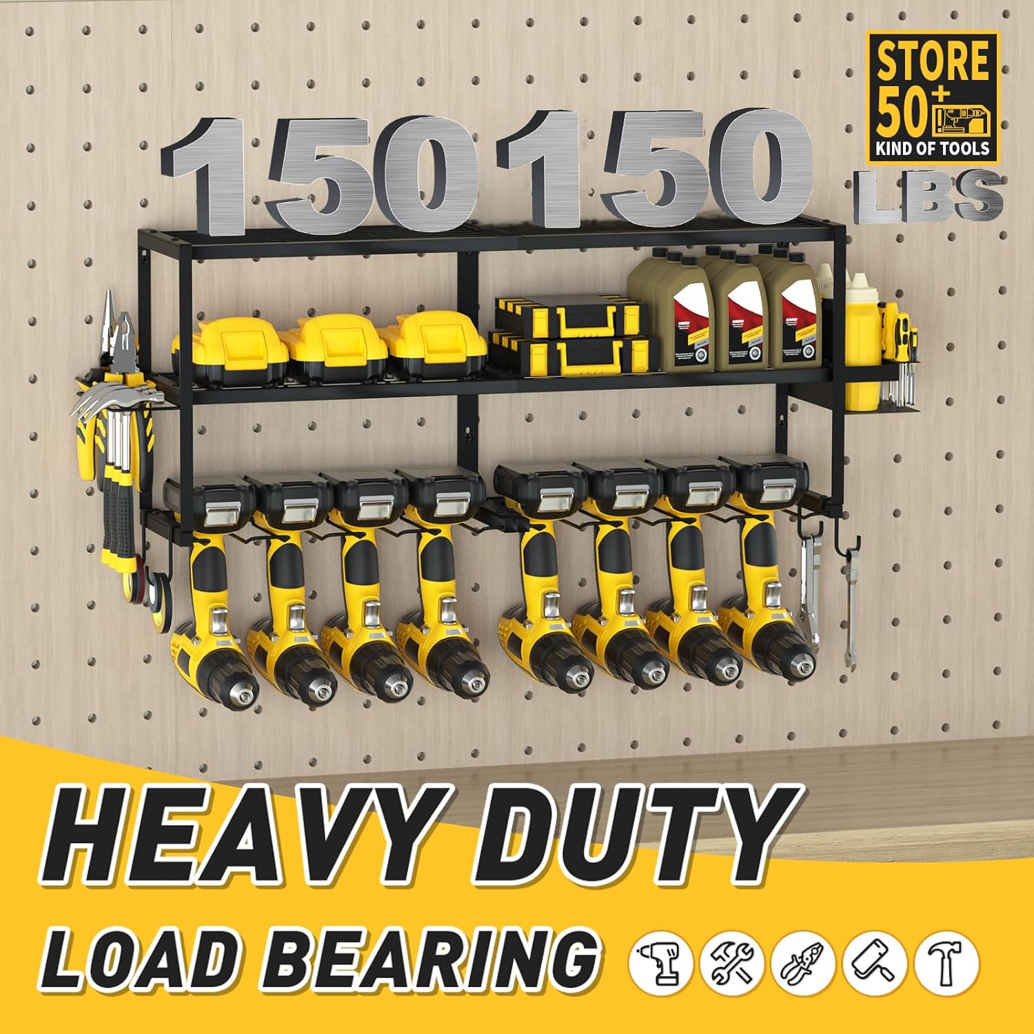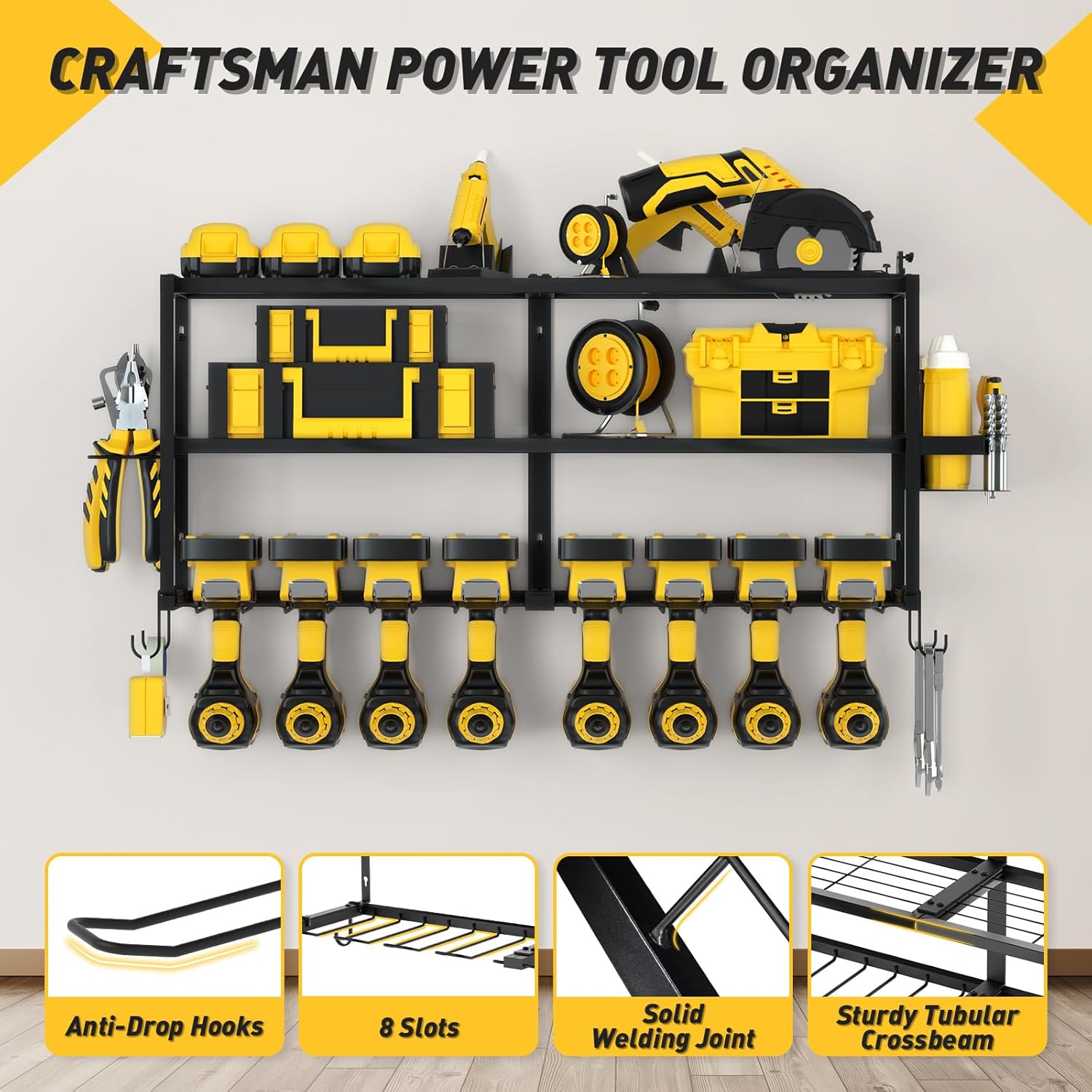 • SPACIOUS 3-TIER DESIGN: Dominate your tool chaos with the Mefirt Power Tool Organizer, featuring 3 ultra-wide tiers (32.6" per tier), over 2 inches wider than average racks for heavy-duty storage. Securely store 8 cordless drills on the reinforced bottom tier, while the expansive top tiers effortlessly organize bulky power tools, wrenches, and small accessories. No more cramped layouts—engineered with 16-inch stud compatibility to maximize wall space and keep every tool visible and within arm’s reach for garages, workshops, or DIY projects
