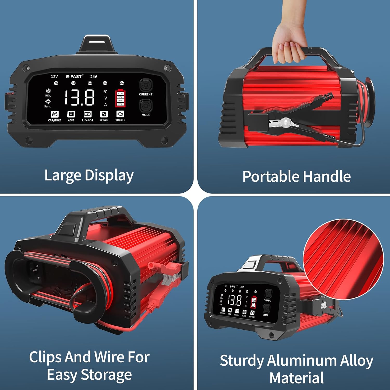 E-FAST 25A Battery Charger, 12/24V All in One Lifepo4 Lead Acid Car Battery Charger, Automotive Jump Starter, Upgraded Trickle Charger, Battery Maintainer for Car Truck Motorcycle Lawn Mower Boat