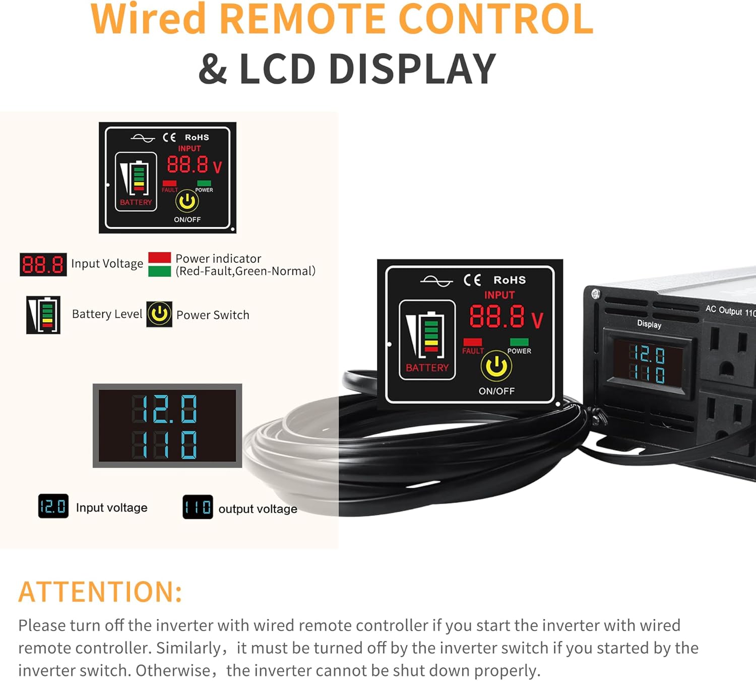 - ăLCD Display & Wired Remote Controlă The 12V power inverter displays real-time input and output voltage, providing clearer and more important usage status information (battery voltage and output power). A wired remote control is more convenient to operate a pure sine wave inverter