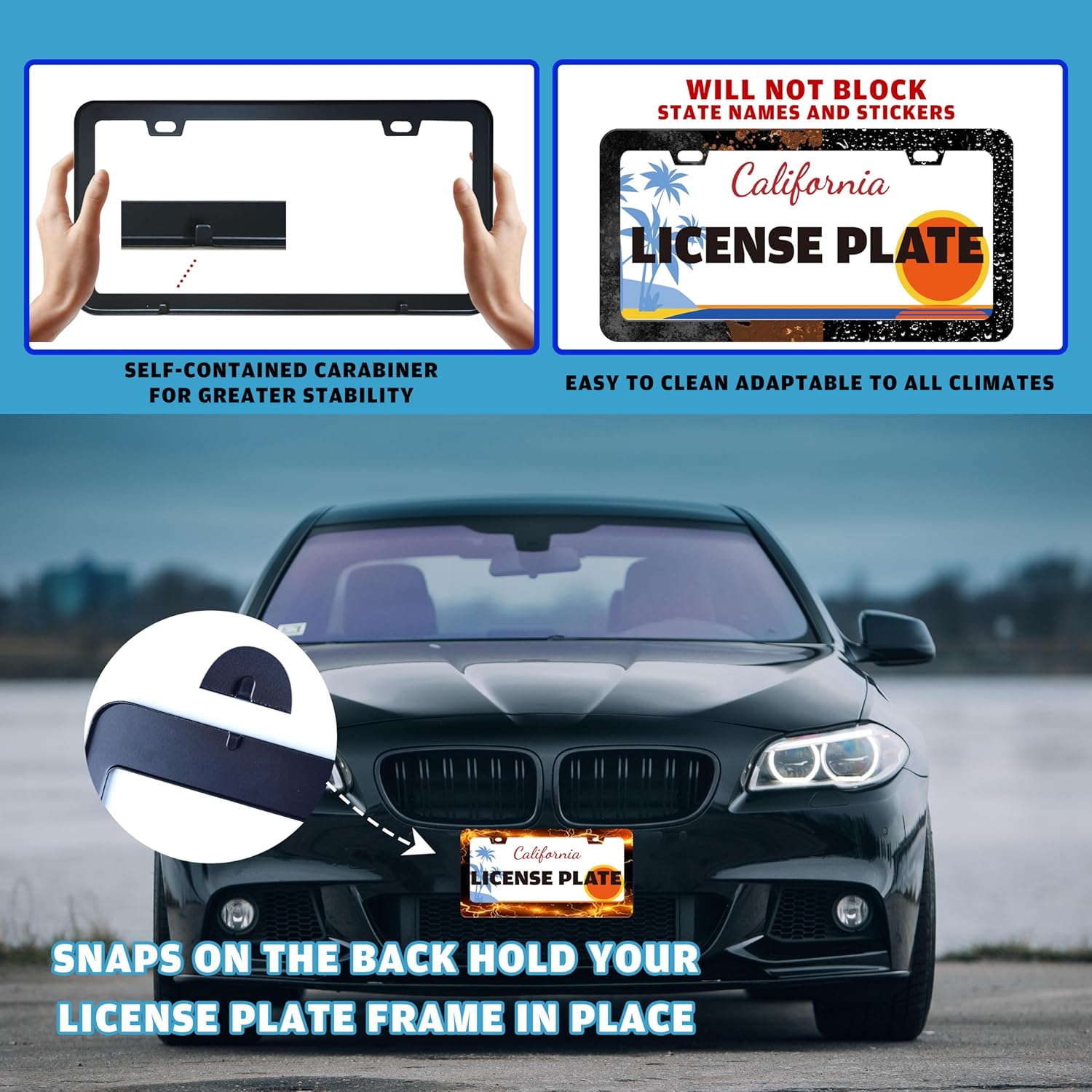 - INTERNAL CLIP FIXATION:There are 2 back clips at the bottom of the back of the license plate frame, which can fix the license plate more stably, allowing you to make no noise while driving, and will not wear the car paint, which is safe rest assured.