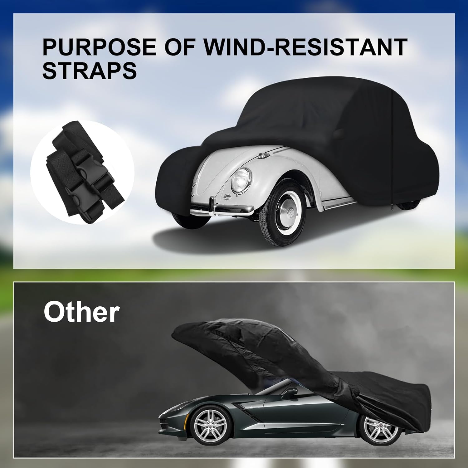 - 【Wind-Resistant Design】: The car cover has been specially designed to resist strong winds. (1) Full exterior car cover with Door Zipper in the left for easy access.(2)2 Windproof straps at Front&Middle Rear ,Adjustable elastic hems at the bottom and four-wheel straps allows you adjust the cover size easily.(3) 6 fluorescent light strips for reflective safety warning lines to protect your car for safe parking at night. (4)Pretty Mirror Pockets perfectly protect your mirror form damage.