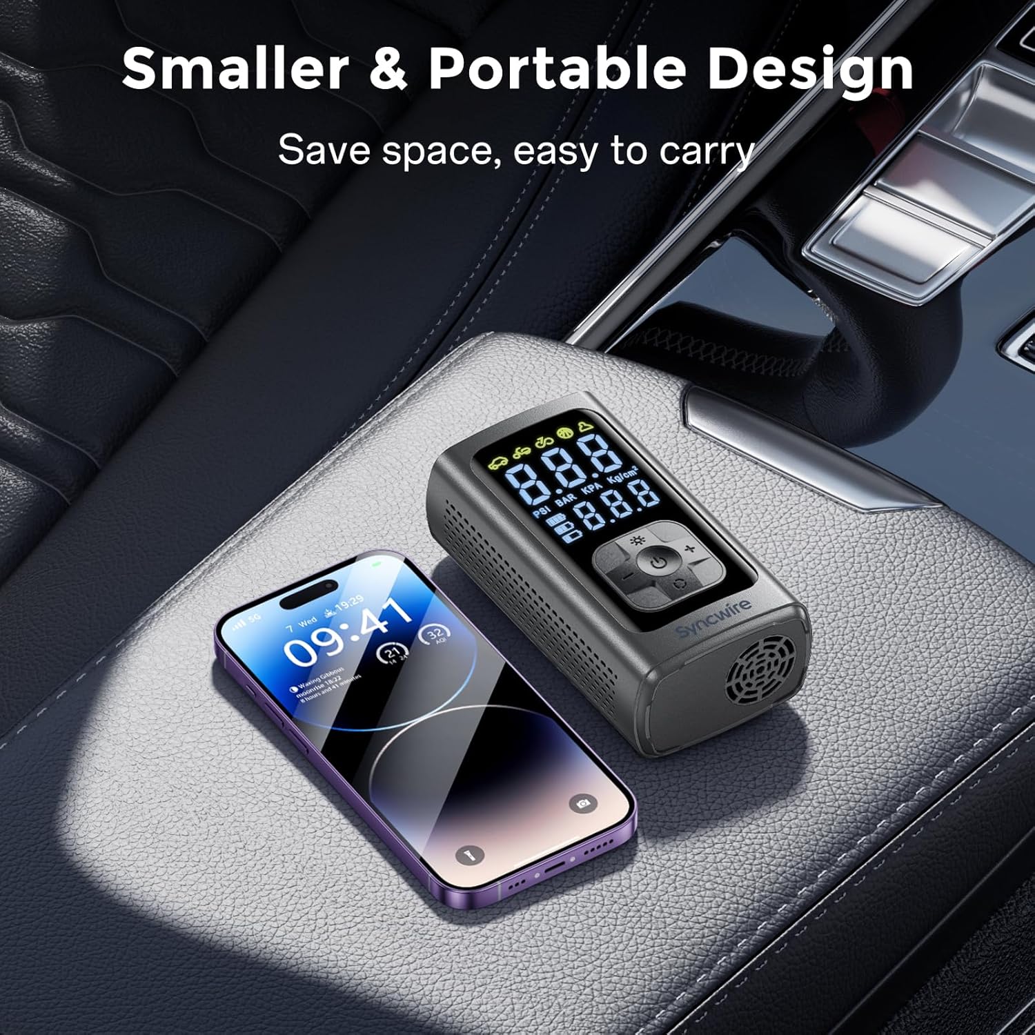 - ă2X Speedy Inflation, Smaller Sizeă- Syncwire portable air inflator is more smaller but inflates 2 times faster than similar competitors, capable of quickly inflating multiple car tires, bicycles, motorcycles, balls, and more in just minutes. With a rated pressure of up to 150PSI, this air pump offers strong airflow, quick speed, and compact size as a smartphone, making it the ideal choice for tire inflation.