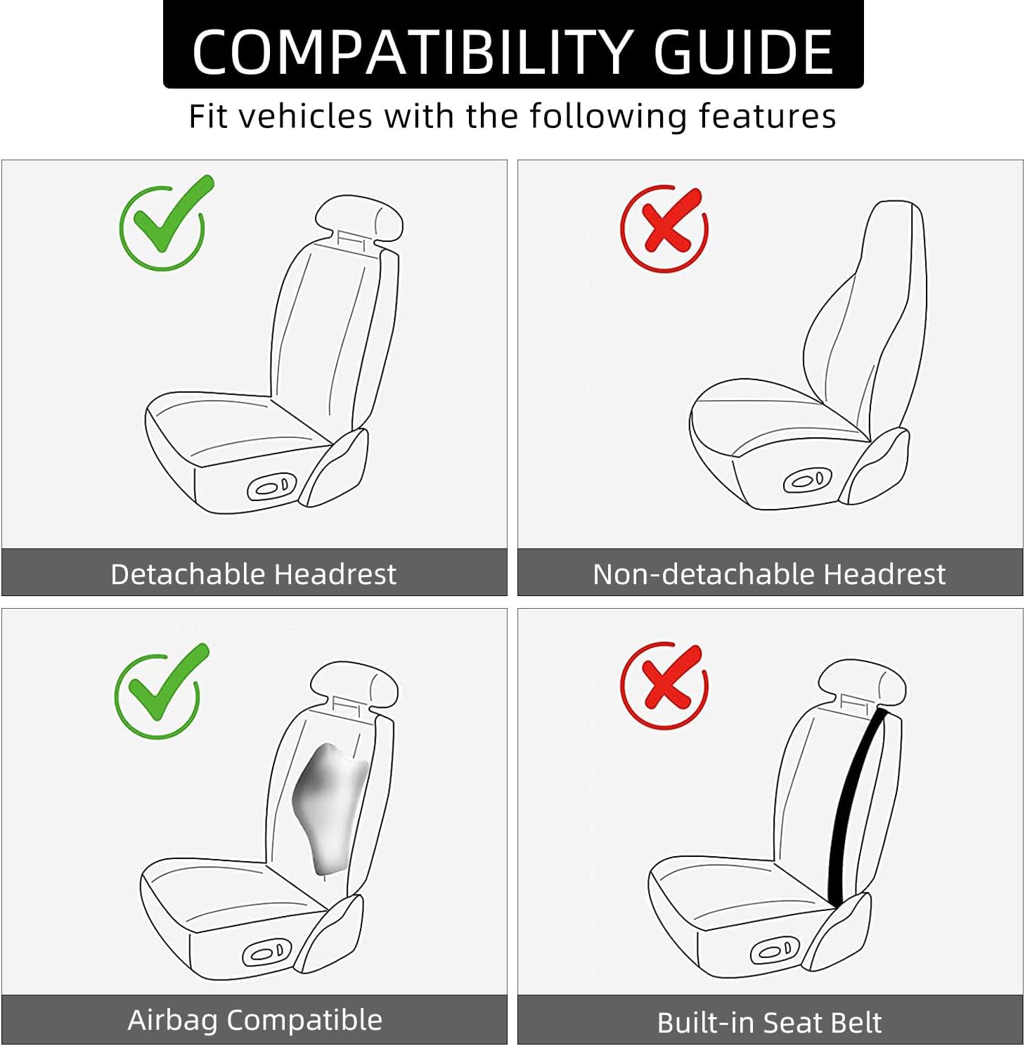 - Airbag Compatible & Extra Accessories : The side of the car seat cover is velcro design, wrapped to protect the side of the car seat cover at the same time compatible with the seat airbag.Extra storage bag and Seat belt cover for car seat cover rotector. Storage bag is perfect for storing small items such as mobile phones, glasses, keys, change and data cables. Seat belt cover, soft and comfortable, makes your driving experience very comfortable.
