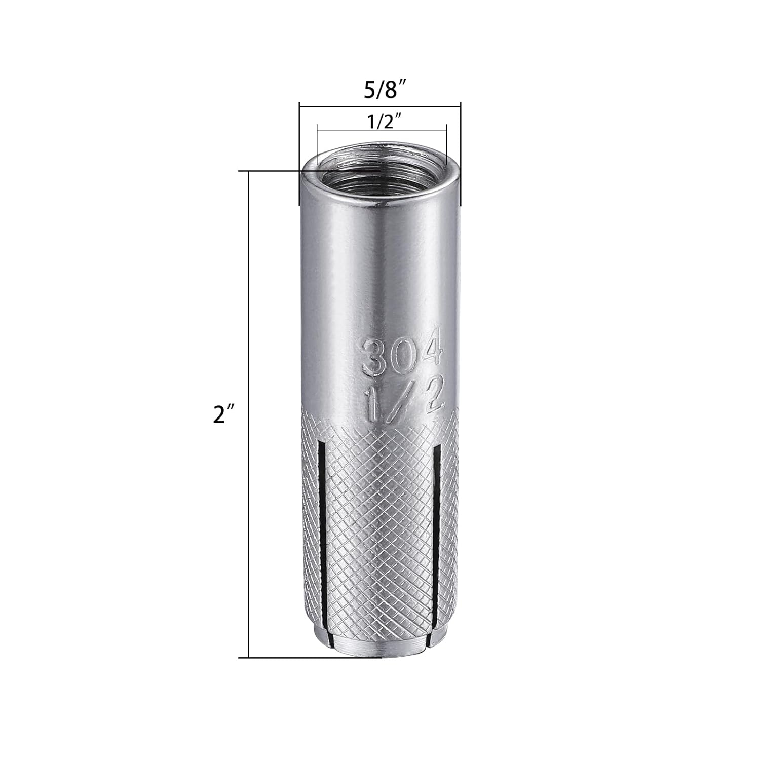 - [Function] 1/2" Inch premium stainless steel material knurled drop in anchors: 2" hole depth and 5/8" hole diameter, use with 1/2-13 bolt.
