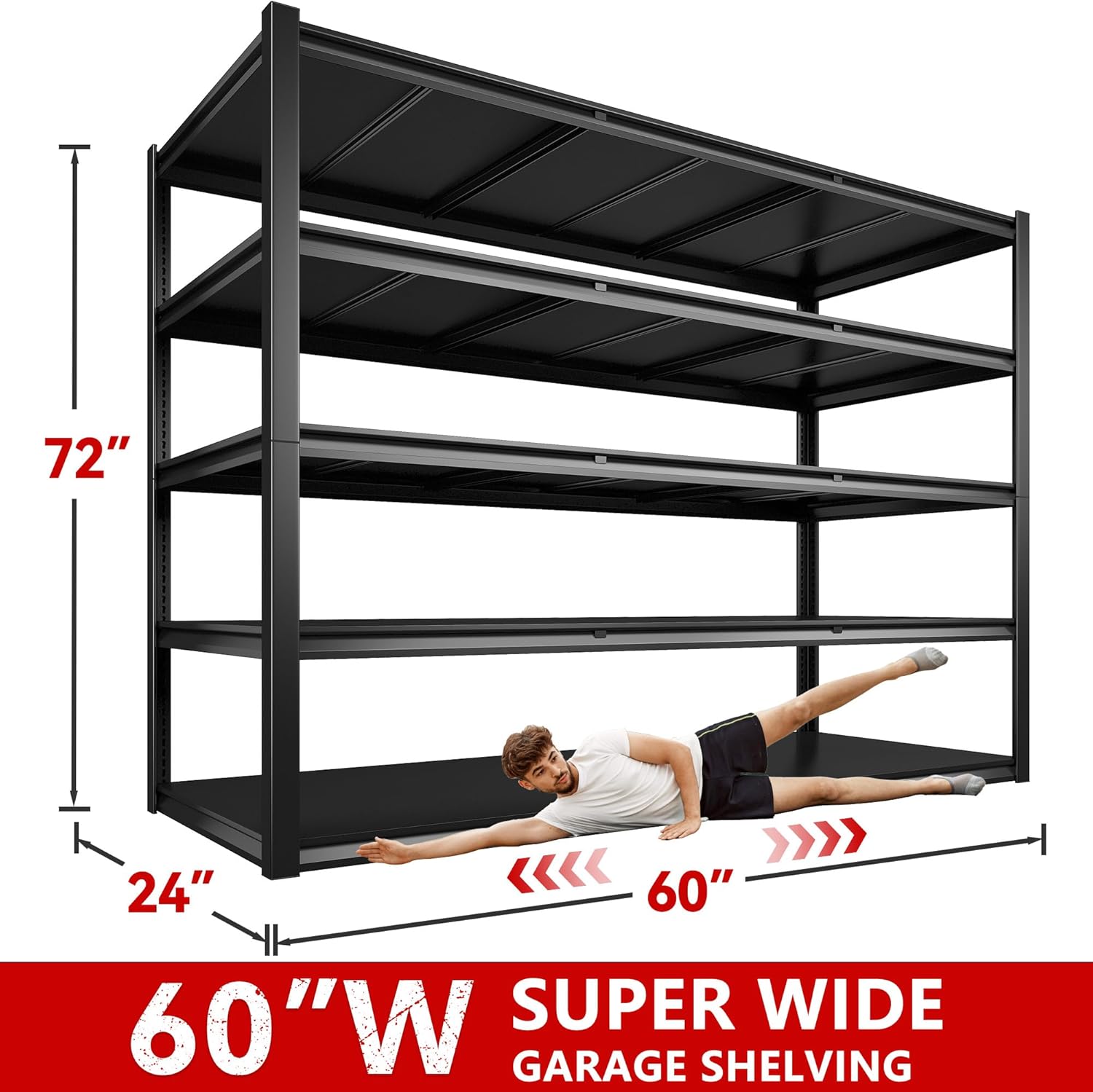 - ă60 "W Garage Shelving Heavy DutyăThe garage shelving are 60"W x 24"D x 72"H, the extra wide storage shelves is suitable for garage, warehouse, basement, pantry and etc.At the same time, the garage shelving can be used as an industrial shelving or commercial shelving, ideal for storing heavy goods such as tire generators or motor oil crates.Built for mechanics, warehouse pros, and heavy-duty organizers.