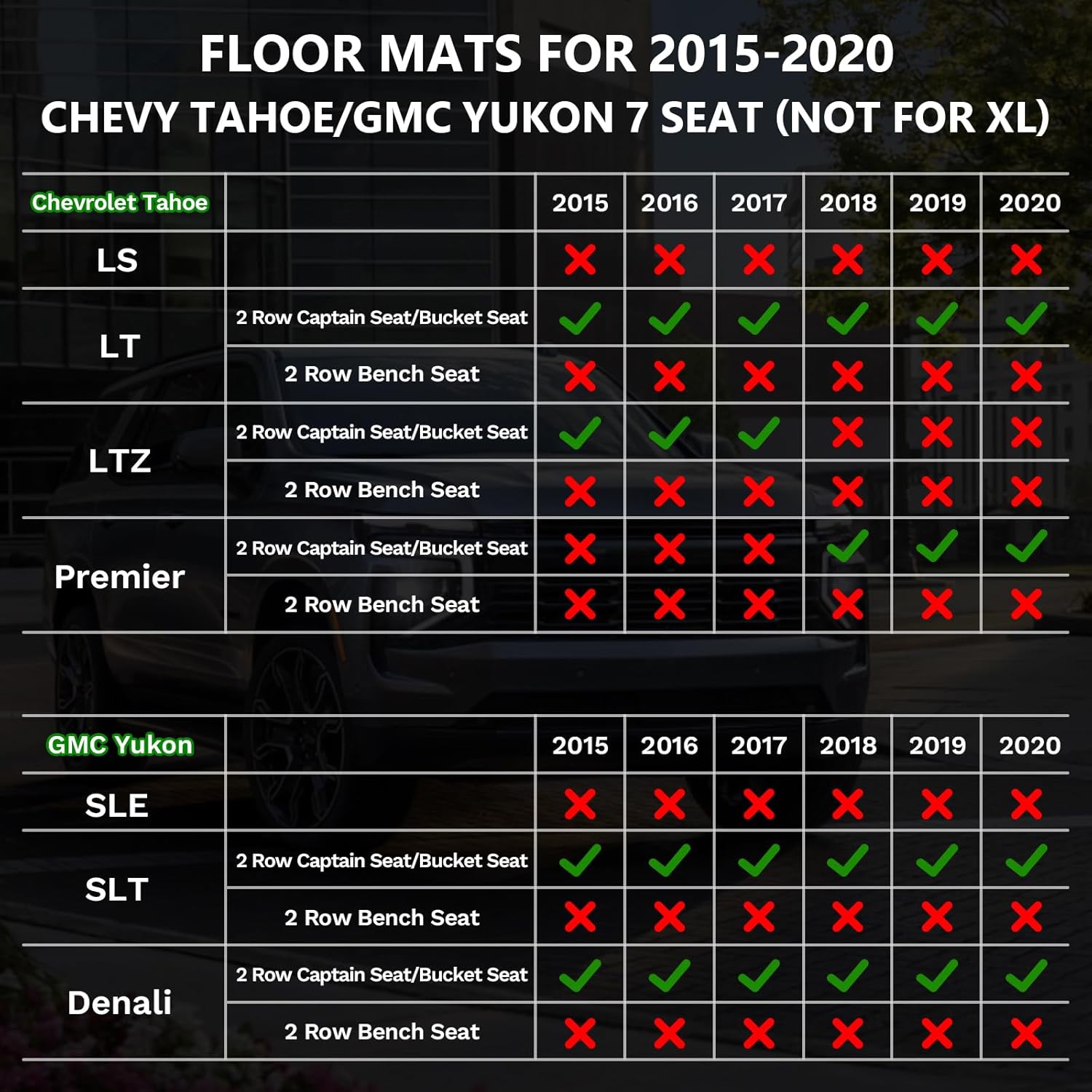 - 【Fit Like A Glove】ANBINGO floor mats custom for 2015-2020 Chevrolet Tahoe/GMC Yukon. Does Not Fit XL Models, accurate body data is obtained through 3D laser scanning, so that the customized car floor mats set and the body fit tightly like a glove, ensuring smooth operation of the accelerator, brake and seat, and providing you with a better driving experience
