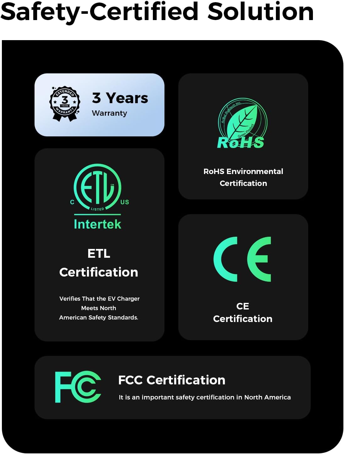 - Safe and Trustworthy: Our smart EV Charger Level 2 has passed ETL certification, FCC certification, and Energy Star certification, ensuring charging safety. These multiple certifications guarantee the high Tquality and reliability of the device, giving you peace of mind during use. Choose our smart charging gun for a safe, reliable, and efficient charging experience.