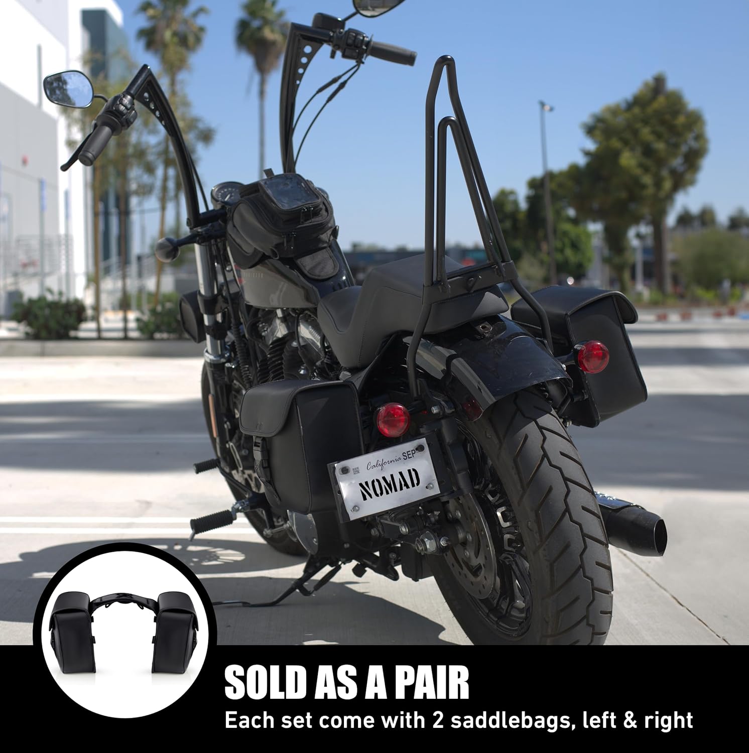 - Fits Multiple Bikes, Universal Fit: The Nomad saddlebags motorcycles are versatile and fit various motorcycles with rocker arms or frames. The motorcycle side bags are compatible with popular models but not limited to bikes such as Harley Davidson Sportster Iron 883, 1200, forty-eight, seventy-two, Roadster, SuperLow, Street 500, Street 750, Softails, Dynas, Honda Rebel 300, Rebel 500, Yamaha, Indian, Suzuki, BMW, etc.