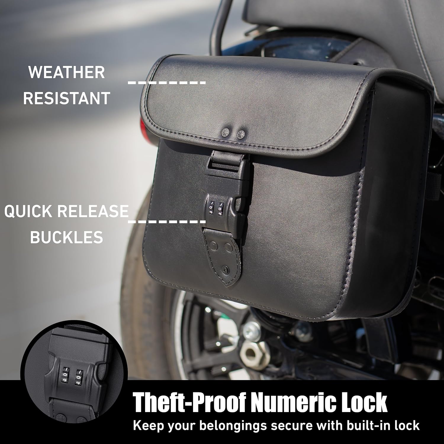- Saddlebags Storage Capacity: With 7.4 liters of storage capacity, these throw over saddlebags keep your essentials close and organized while on the road. The cruiser motorcycle saddlebags measure 10.24β x 9.45β x 4.57β (L x W x H) and spacious saddlebags offer ample space to store items such as raincoats, water bottles, lighters, sunglasses, wallets, keys, phones, locks, food, and more. Enjoy the convenience of having your daily necessities within easy reach.