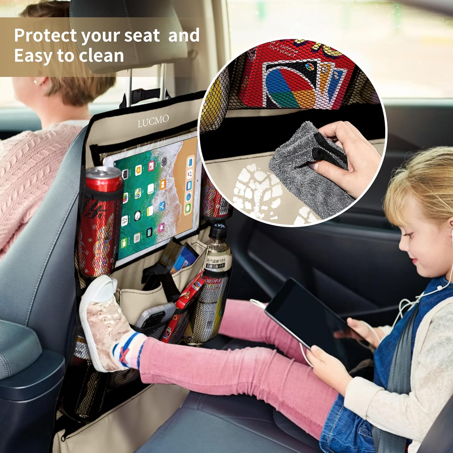LUCMO Car Backseat Organizer with Touch Screen Tablet Holder-2 Pcs,9 Storage Pockets Car Storage Organizer Protectors Kick Mats Travel Accessories for Kids-Beige
