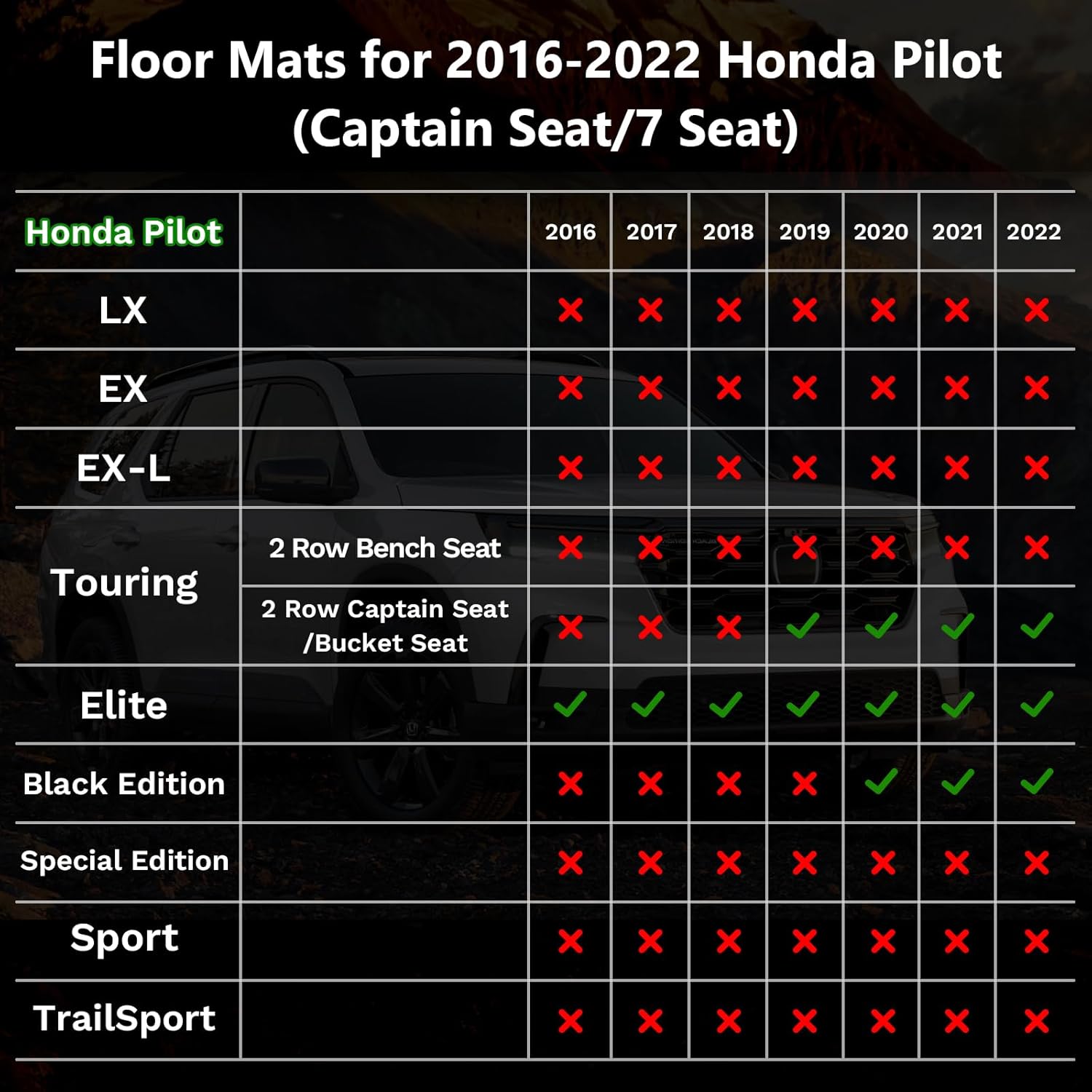 - 【All Weather Protection】ANBINGO all weather car floor mats for 2016-2022 Honda Pilot are suitable for all kinds of harsh conditions, and are still elastic under conditions of -58°F, Not Crack and Deform. The floor mats adopts a high lip design, which can effectively block pollutants such as rain and snow, sewage, sediment ,and keep the car interior clean