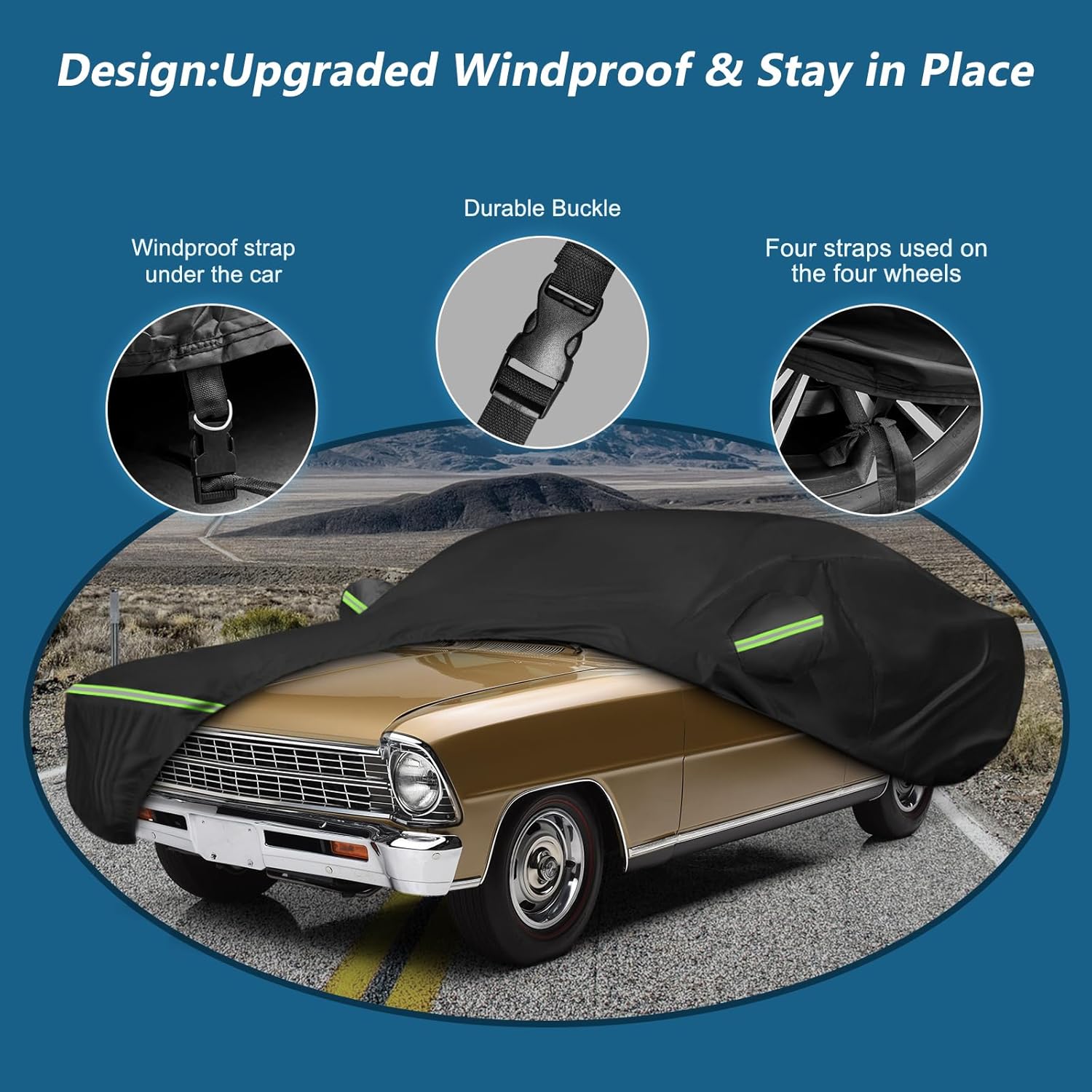 Waterproof Car Covers for Chevrolet II Nova/Nova SS 350/350 SC Sedan/Coupe 1962-1974,420D Oxford Cloth Sun Heat Protection Outdoor Full Covers with Driver Side Zipper Windproof Heavy Duty All Weather