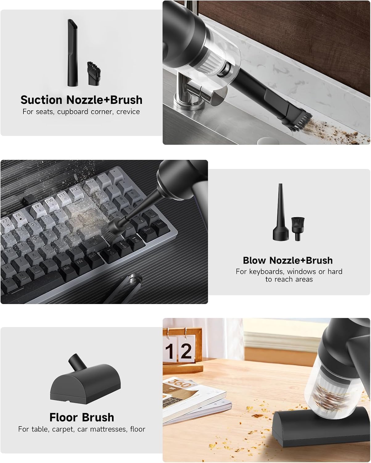 - ăComprehensive Multi-Surface Cleaning KităMini vacuum cleaner includes 5 specialized accessories for multi-surface adaptability, great as a portable vacuum for car detailing. Suction nozzle reaches narrow gaps (sofas, seats). Blow nozzle clears keyboards and windowsills, inflates balloons, swim rings. Floor brush tackles food residues, pet hair on tables or carpets. 2 soft bristled brushes work with suction and blowing modes to loosen stubborn residue. Versatile cleaning.