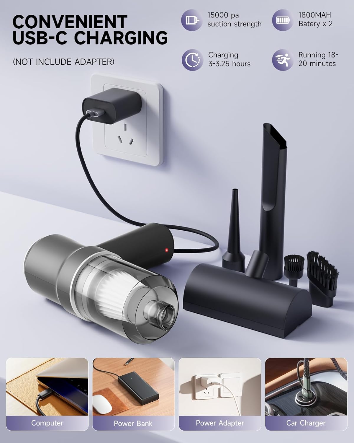 - ăConvenient Cordless & Rechargeable DesignăEnjoy cord-free use with this hand vacuum cordless rechargeable unit (dual 1800mAh batteries). As a reliable hand held vacuum, it recharges via included Type-C charging cable (Needs Adapter) from car charger, power bank, laptop. Flexible charging suits mobile use. A 3-hour fully charged yields 20 minutes of strong suction. Allows substantial cleaning without cord limits, enhancing usability anywhere.