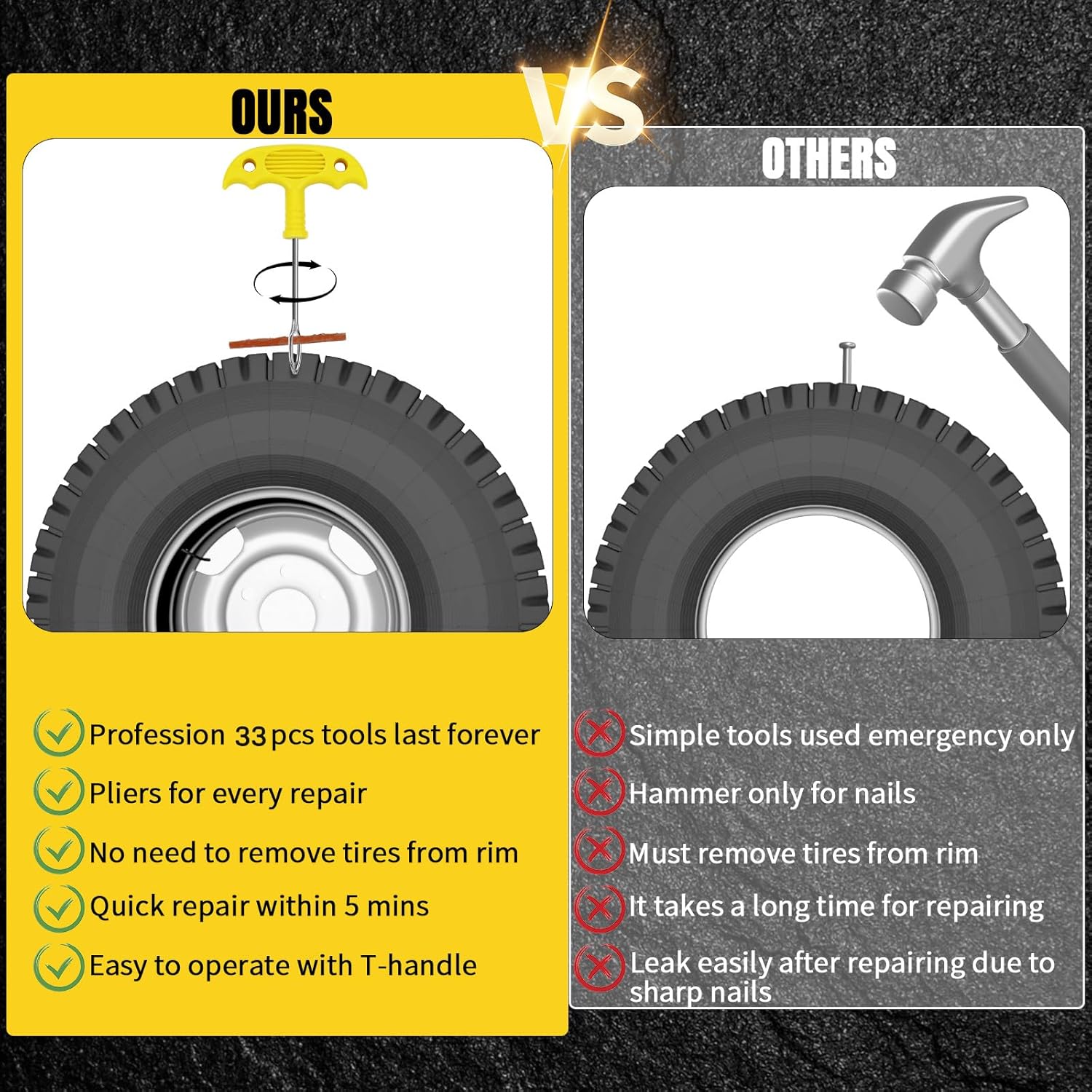 Tire Repair Kit, 33Pcs Heavy Duty Tire Plug Kit, Universal Tire Repair Tools to Fix Punctures and Plug Flats Patch Kit for Cars, Motorcycles, Atvs, Tractors, Etc