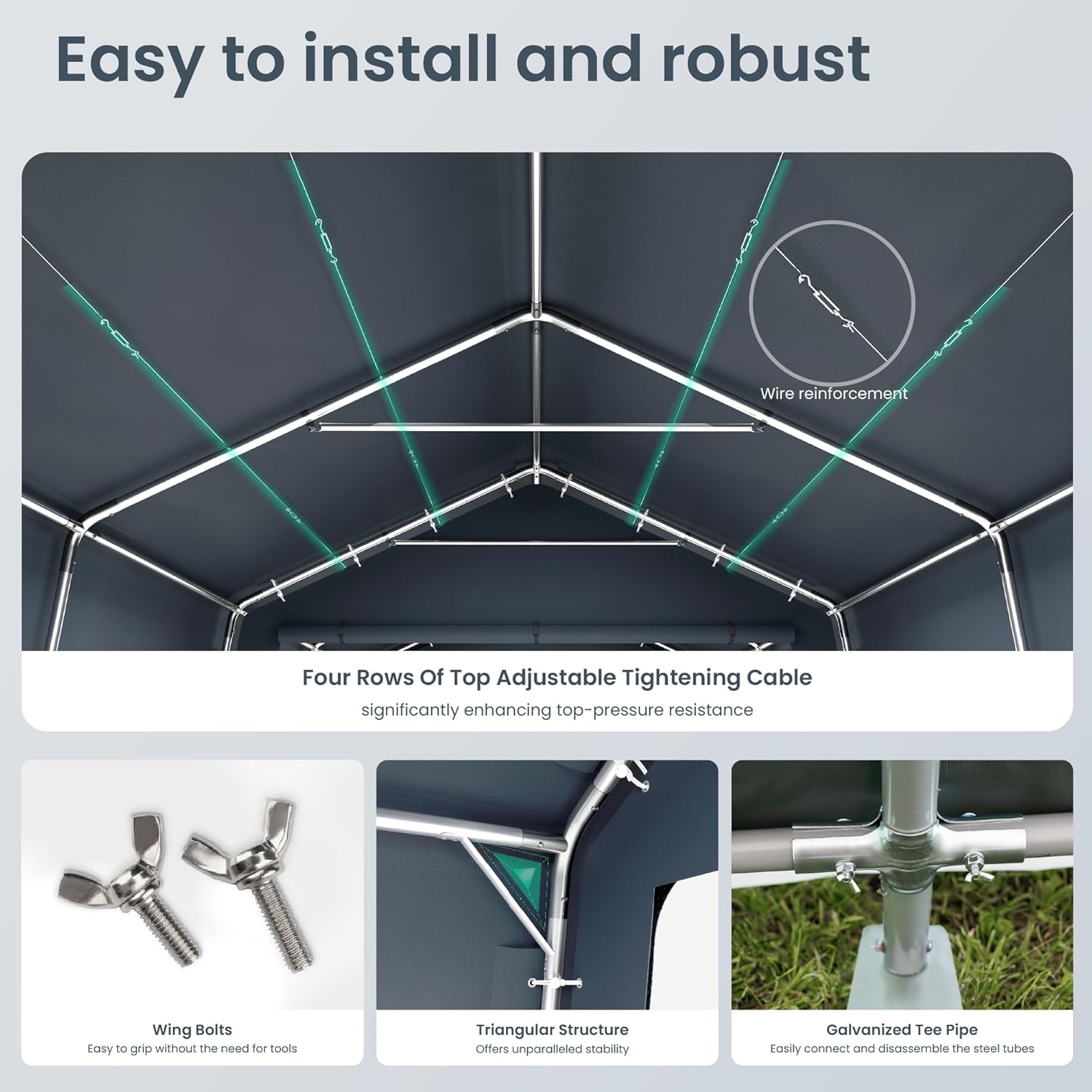 - Removable Rollup Dualzipper Doors: Easy access and better visibility. The doors with double zippers and buckles can be removable or rolled up. Doors at the front and back of the storage shelter for easy entry and exit, better visibility and facilitate air circulation.