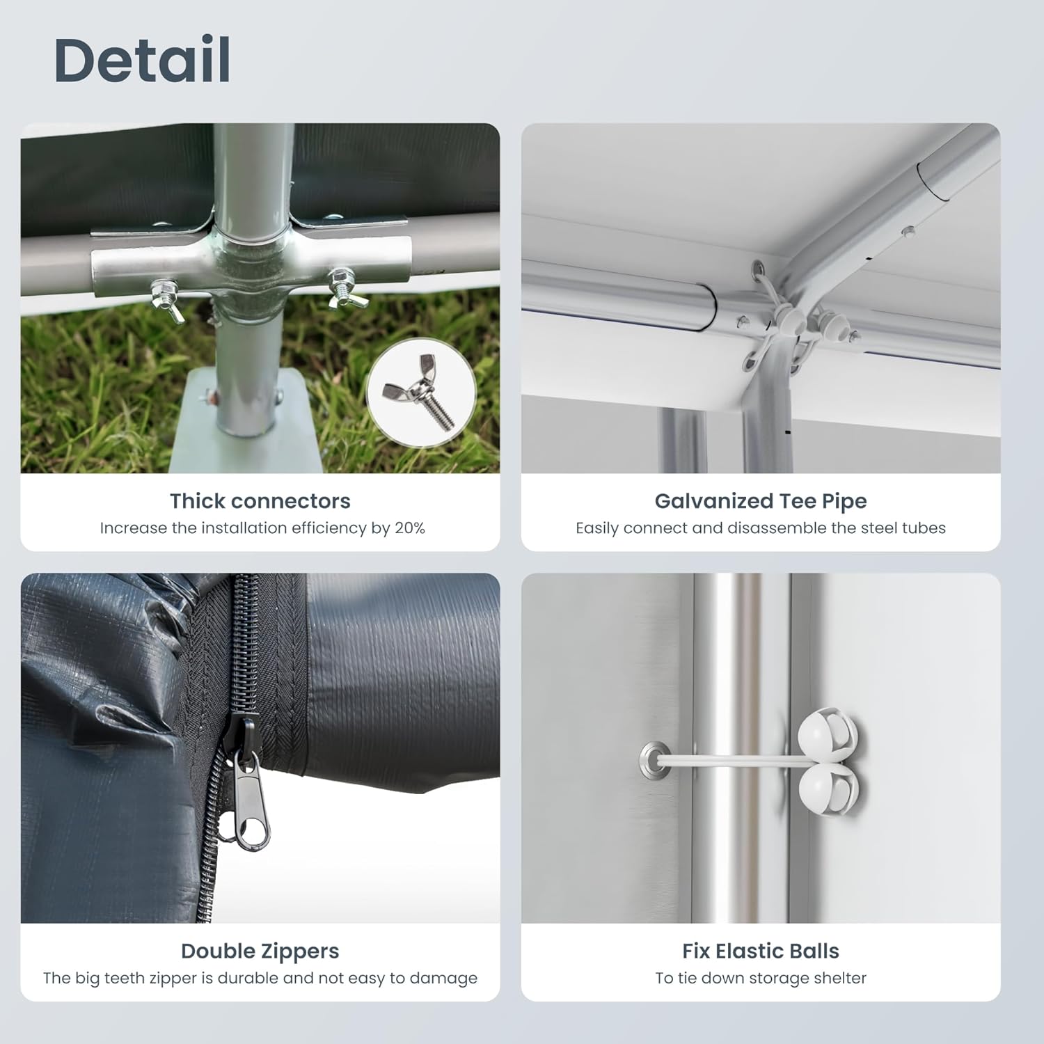 - Removable Rollup Dualzipper Doors: Easy access and better visibility. The doors with double zippers and buckles can be removable or rolled up. Doors at the front and back of the storage shelter for easy entry and exit, better visibility and facilitate air circulation.